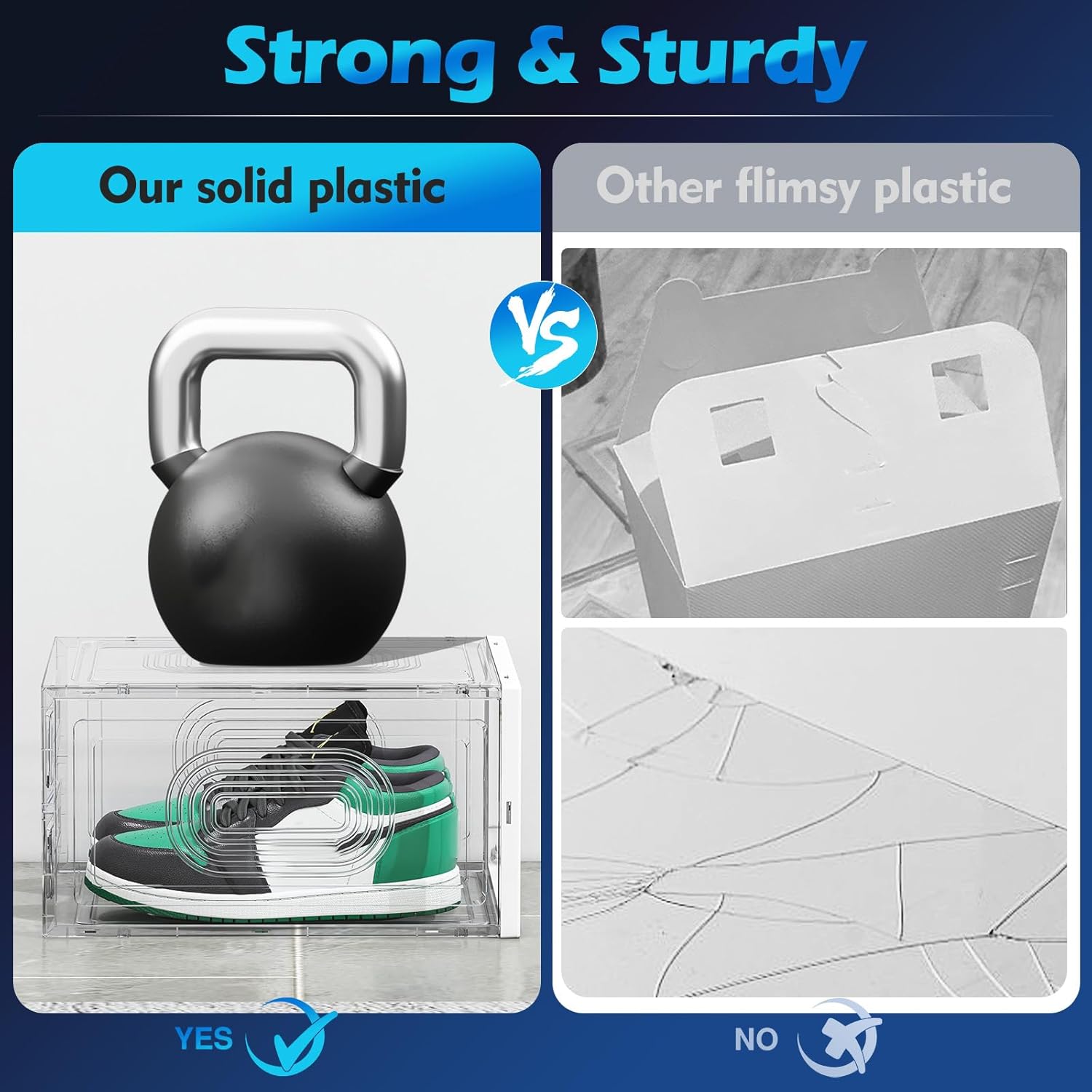 - 【Clear Shoe Box Stackable】Clear magnetic front door, stackable design, harder material, the shoe storage organizer provide you a more load-bearing multiple layers of shoe walls.You can find out the shoes with a glance over the boxes without open the boxes