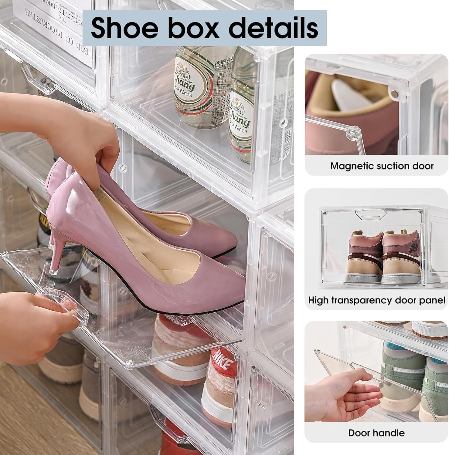 - 【Clear Shoe Boxes Stackable&Magnetic Door Ventilate Design】The sneaker storage has a simple interlocking design, and each stackable shoe bins storage can be connected together,keep it from falling when tilting. The frame of shoe box greatly enhances the stability.The door of the shoe box equipped with upgraded magnetic suction design, its door has two upgraded magnets which provide suction when the door is closed, Ventilation design always keeps fresh air exchange and effectively prevents odor
