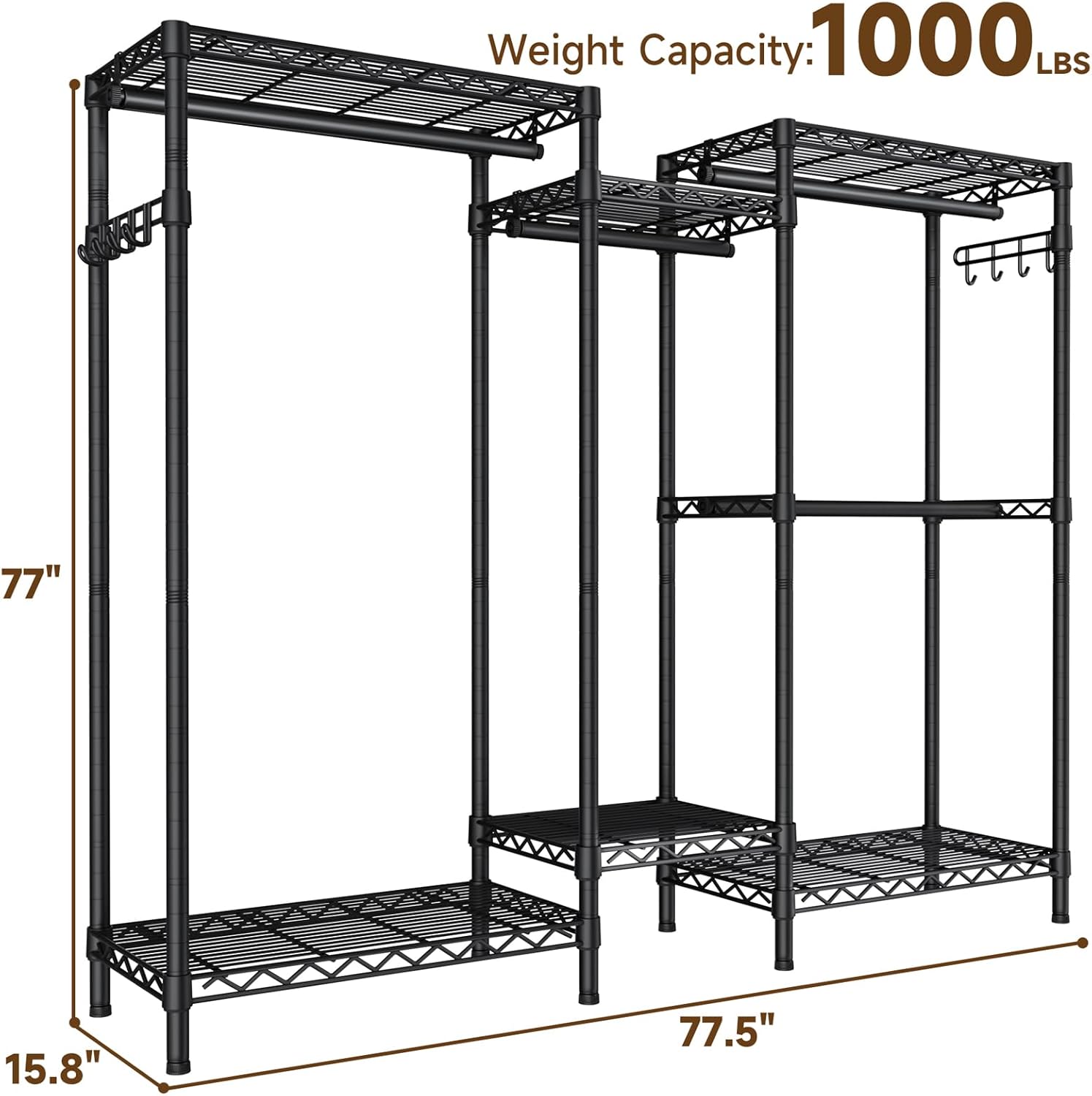 - Exceptional Strength and Capacity: Unleash the power of our Heavy Duty Garment Rack, meticulously engineered for superior strength. With dimensions measuring 15.75βDX77.5βWX76.37βH, this robust rack boasts an 1000lbs load capacity, featuring individual hanging rods supporting up to 80 lbs each.while each the side hook adds an extra 20 lbs of convenience.Enjoy the freedom to organize and store a substantial wardrobe without compromising on stability or durability