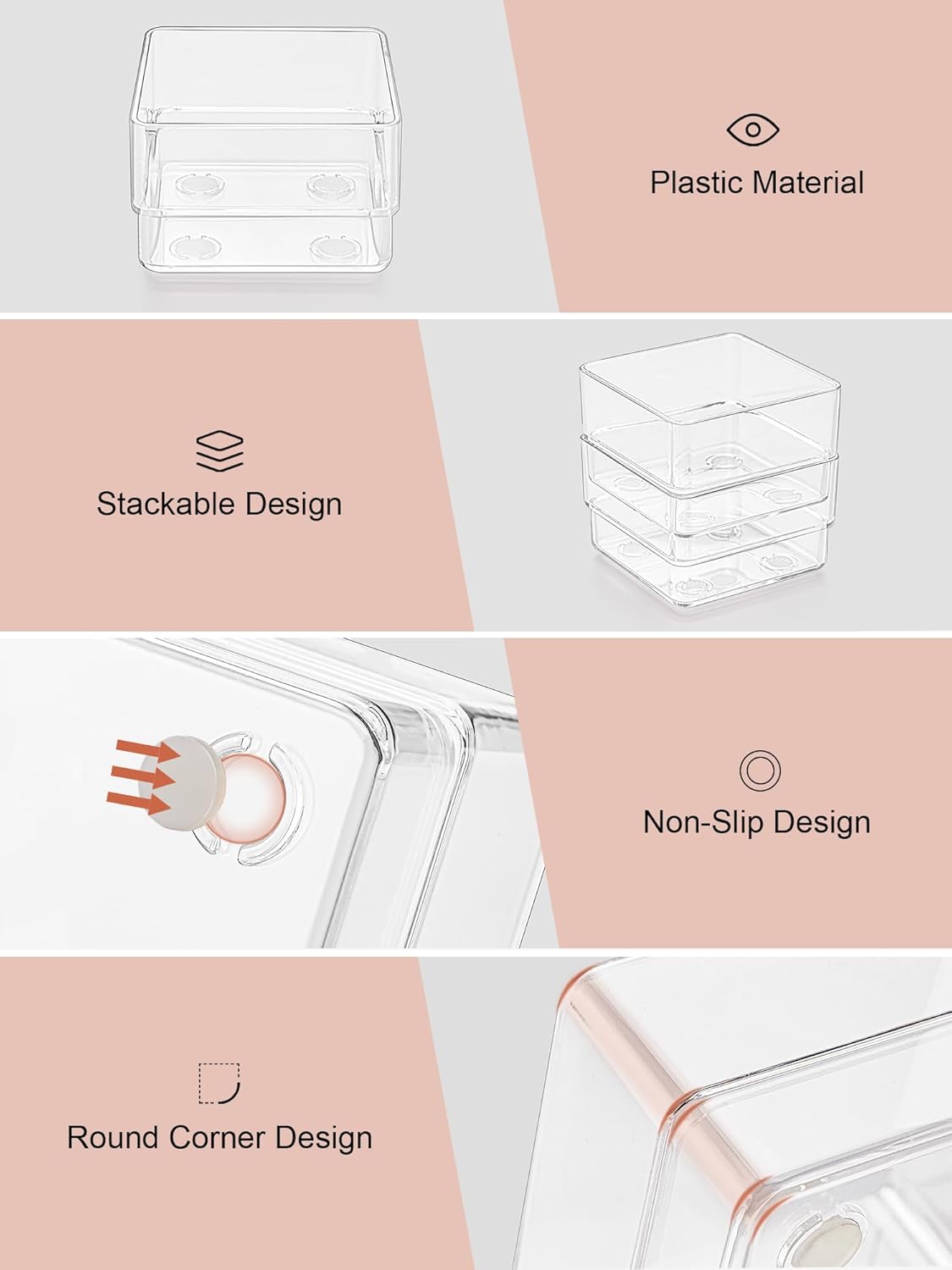 - Durable and Non-Slip Material - The clear drawer organizers made of unbreakable plastic, ensure a long life of use. Silicone non-slip pads at the bottom of the bin prevent the box from moving freely when dragging the drawer.