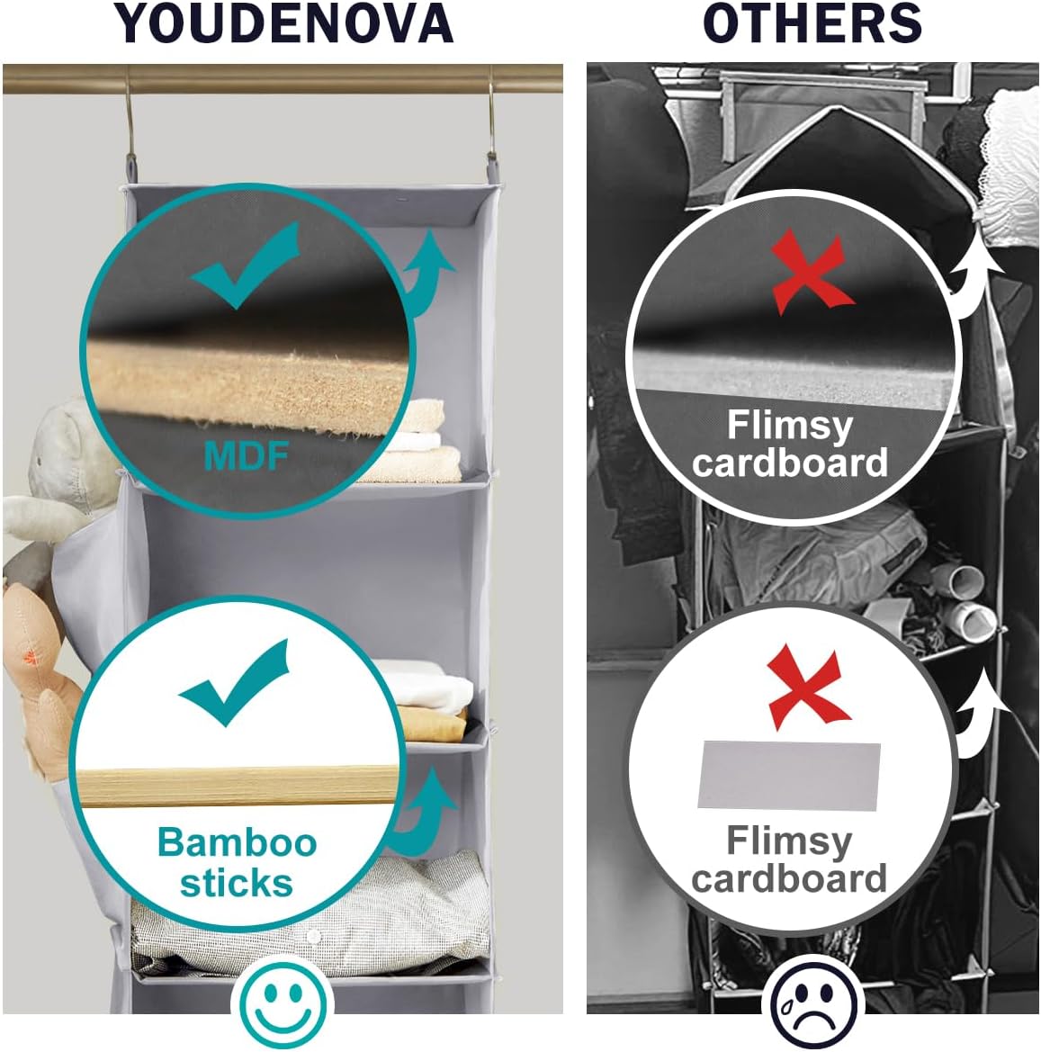 - HIGH QUALITY: This hanging closet organizer is made of sturdy and thick non-woven, built to last. Unlike some similar product, this one has 2 pcs sturdy bamboo inserts at each shelf and MDF board at top & bottom, which can avoid the compartments bending.