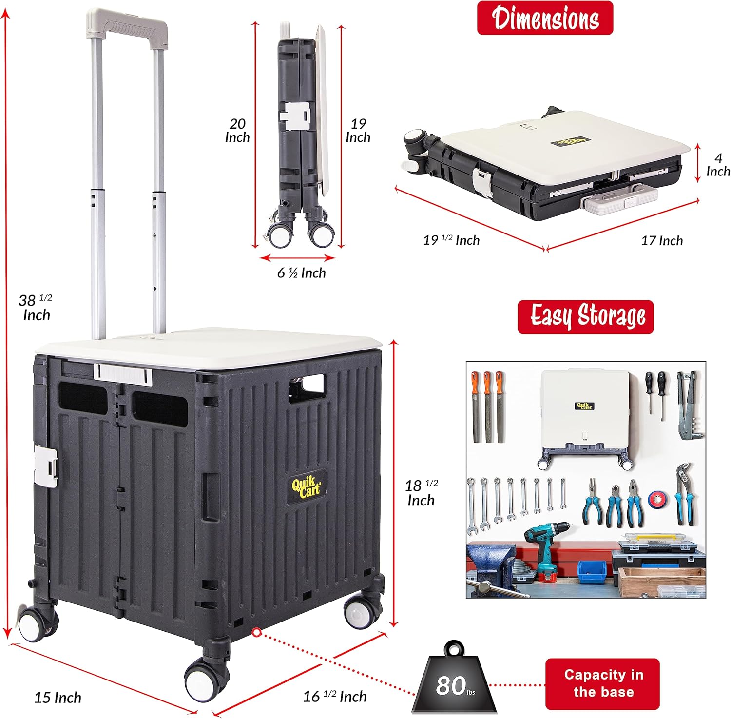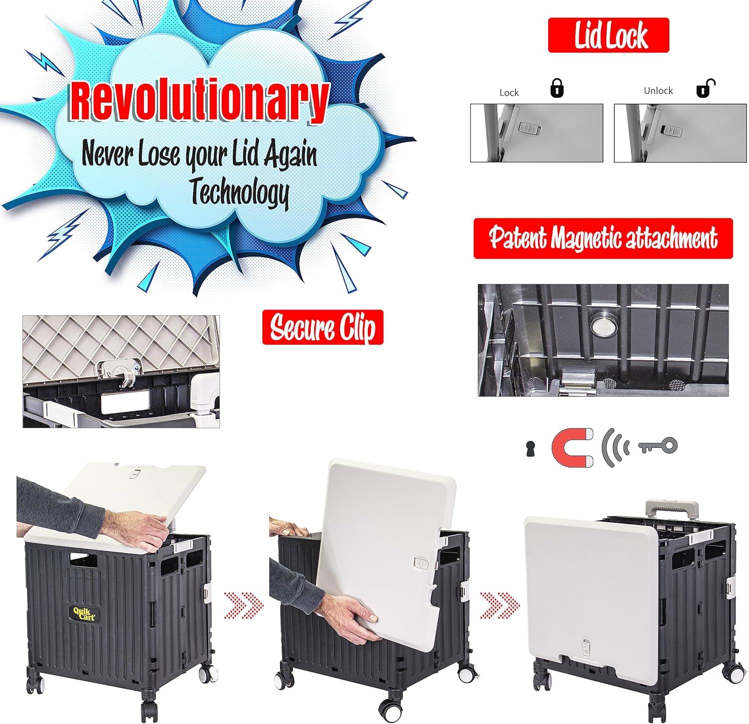 dbest products Quik Cart Swing Lid Four Swivel Wheeled Rolling Crate Teacher Utility with seat Heavy Duty Collapsible Basket with Dual Telescopic Wagon Handle