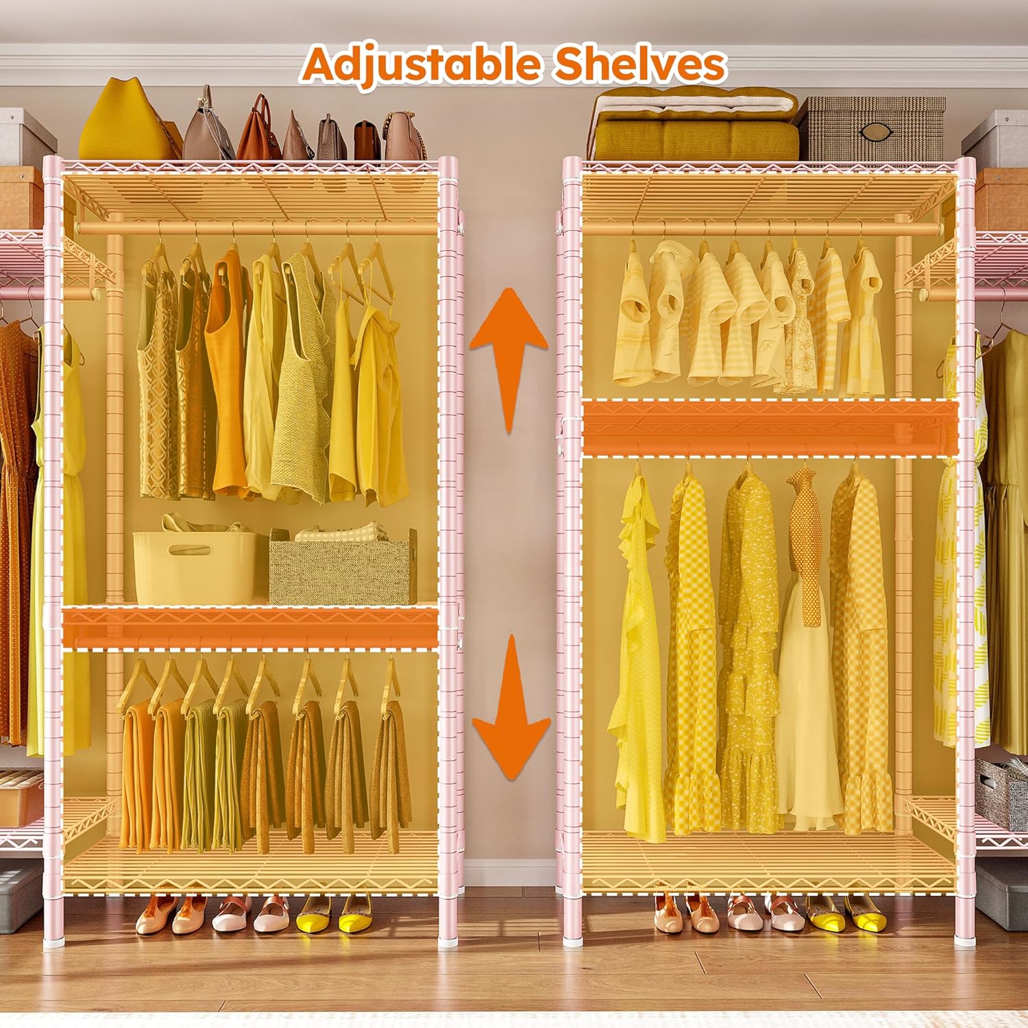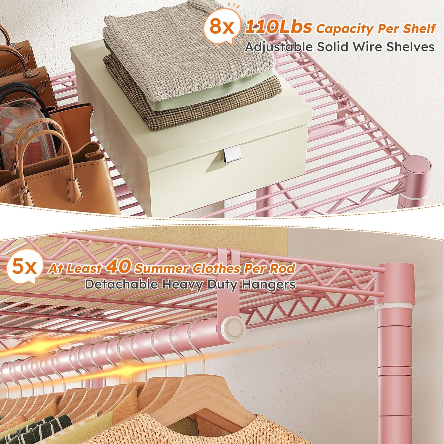 - 【Fully Adjustable & Easy-to-Adjust】This garment racks for hanging clothes has 8 wire board(110Lbs capacity per tier) and 5 hanging rods(80Lbs capacity each), they are all easily adjustable and detachable by the slip-sleeve locking system, all you need to do is assemble the clips higher or lower. A perfect DIY garment rack meets all needs.