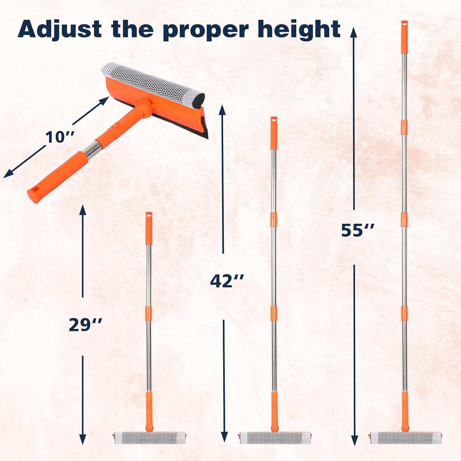 - 【Cost Performance Selectionl】:The 2 in 1 window squeegee is 10 inches and the length of the pole can reach up to 55 inches (4 section of handles), you can clean high windows.Package include 1 super absorbent sponge scrubber with mesh and natural rubber squeegee,four section of extension handles.