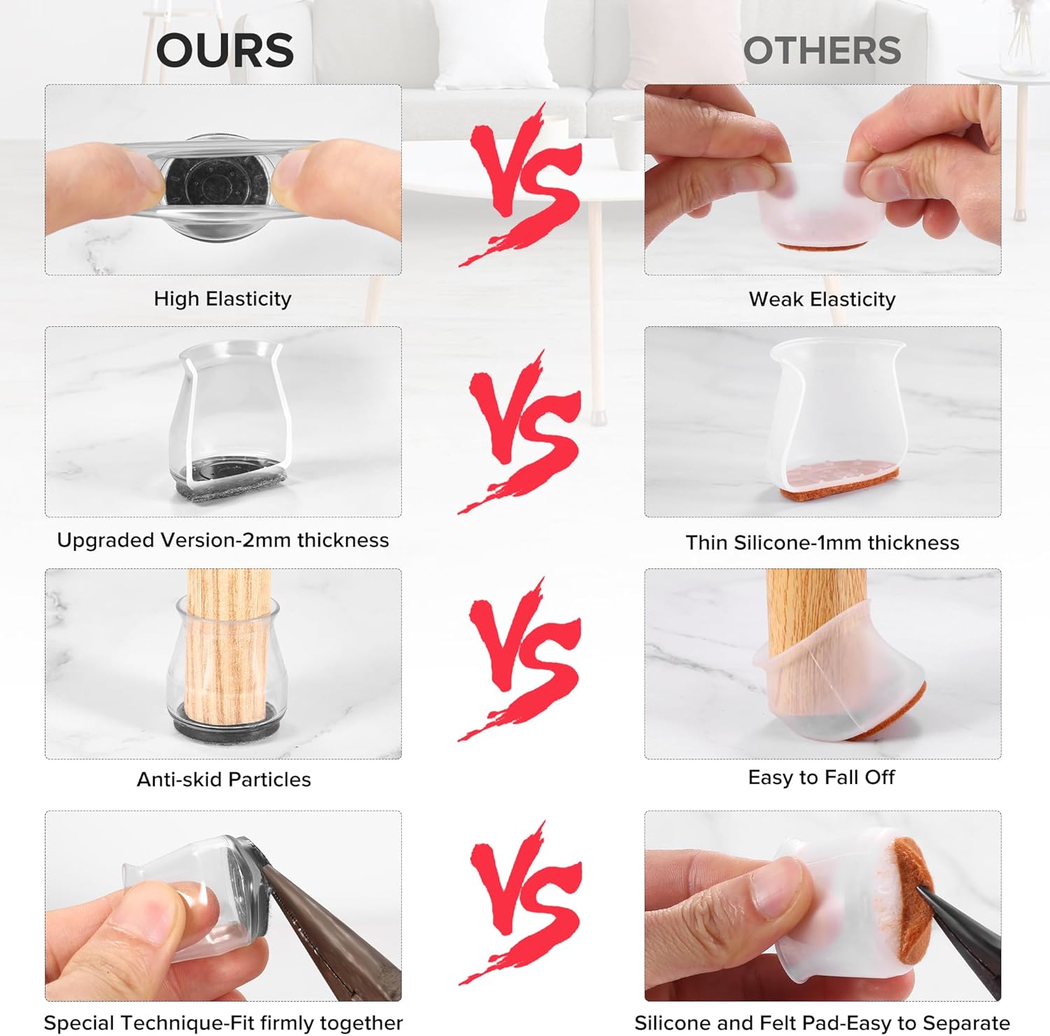 - ✅【Latest Upgrade】Compared with most of the traditional 1mm furniture pads on the market, our silicone chair leg protectors are made of 2mm thick silicone, which will never be damaged, durable. The ruby for chair legs will not change color when stretched. Inside of the inner sleeves are particles with anti-slip, which will firmly fix the chair and never make the covers fall off. Felt pads at the bottom make your furniture move silently and smoothly along floors without leaving marks and noise.