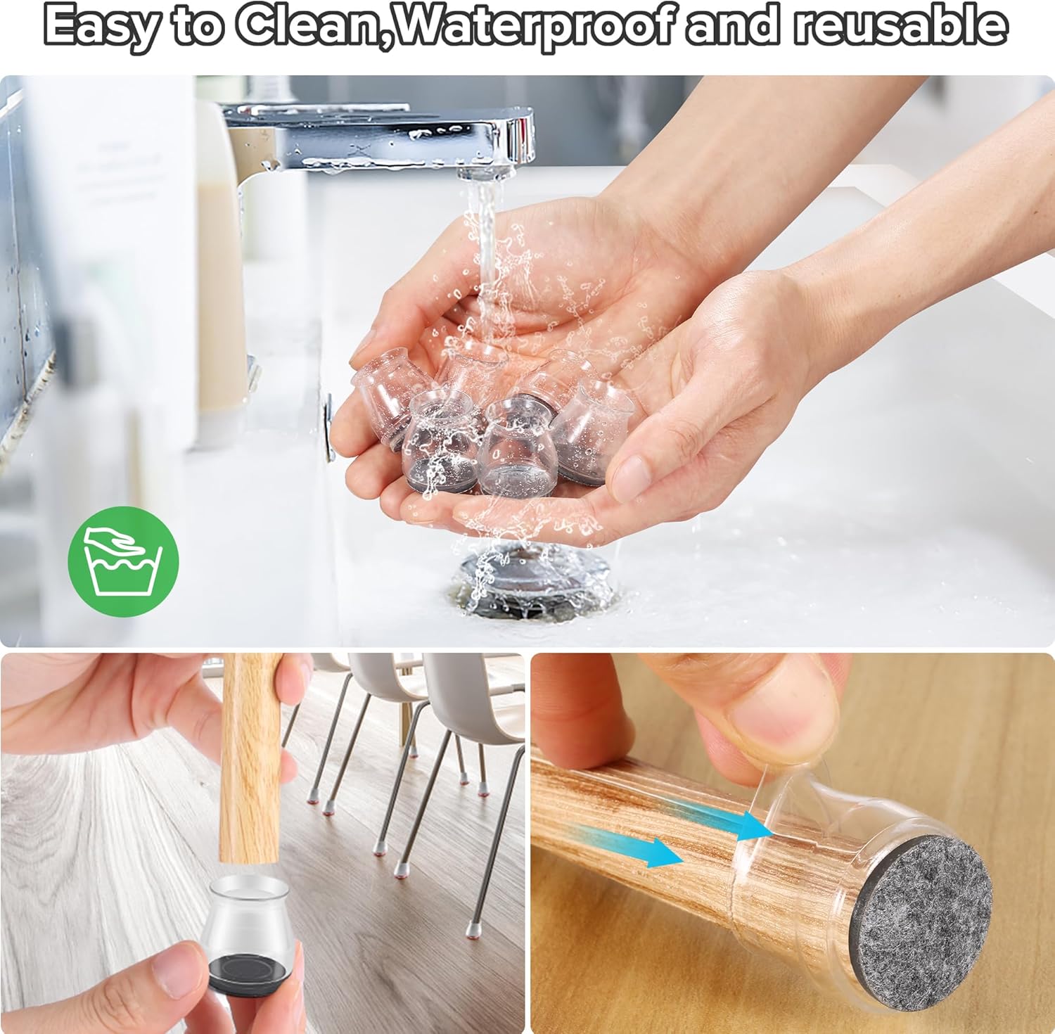 - ✅【Easy to Use】The chair leg covers to protect floors has high transparency, which greatly restore the original color of the table and chair legs, look more natural. The furniture leg cap is easy to install, without the use of tools. When the furniture chair socks are dirty, the chair stoppers can be cleaned and used repeatedly. Mainly suitable for smooth floors such as hardwood, tile, composite floor, and vinyl floor. Clear cap style match with most floors.