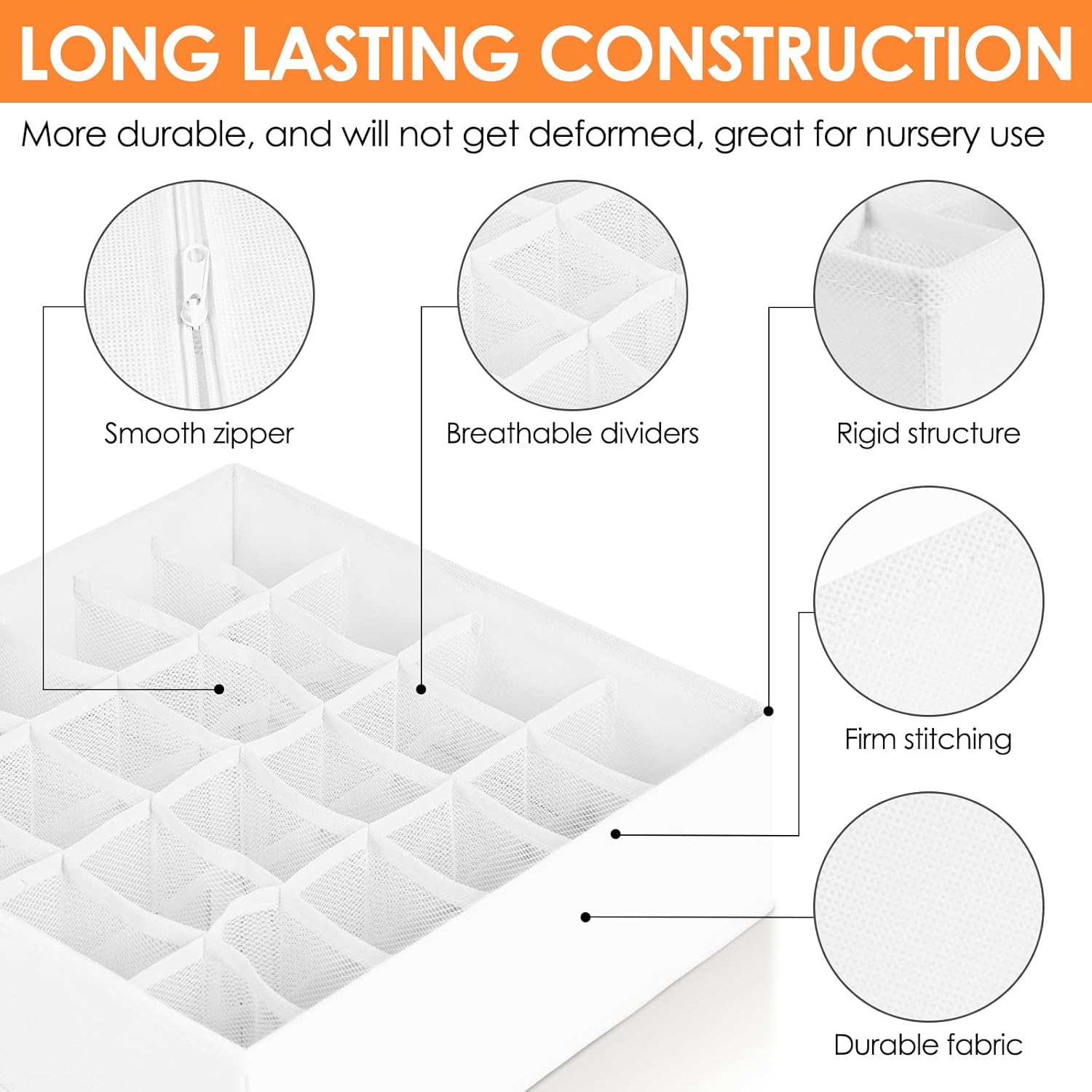 - ăQUALITY CONSTRUCTIONă Made of 80gsm thick non-woven fabric and reinforced stitching, our wardrobe clothes organizer is much more durable for long term use. 3.0mm Plastic boards added at the 4 sides are breathable and odorless, so great for nursery room use. Also sturdy enough, so stackable and not easy to deform.