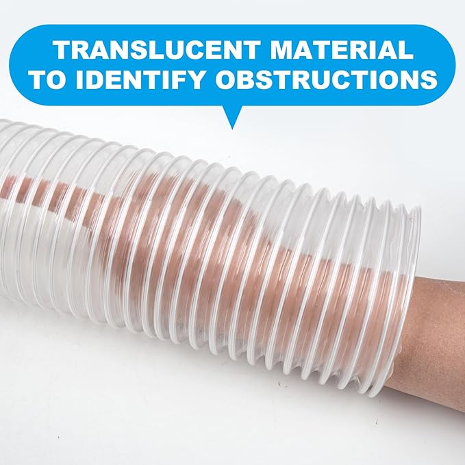 - 【Clear Pvc Dust Collection Hose】This PVC hose is clear which allows you to see what’s going on inside the hose while the dust and debris are flowing through it. Not only can you see the dust and debris, you can also see if any build up or blockage has occurred. Being able to see this makes fixing any suction issues with the hose much easier than typical opaque hoses.