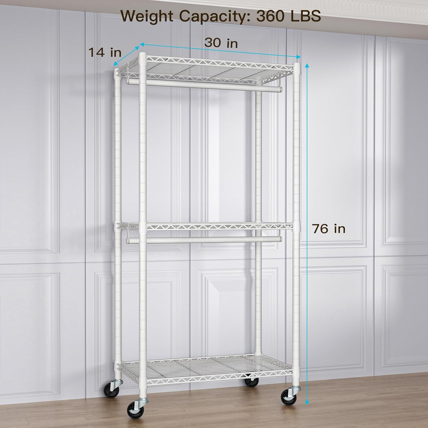 - [Overall Size & Load Weight]: The overall dimension is 30"W x 14"D x 76"H, and it can load 360 pounds with 3 adjustable wire shelves and 2 sturdy clothes hanging rods