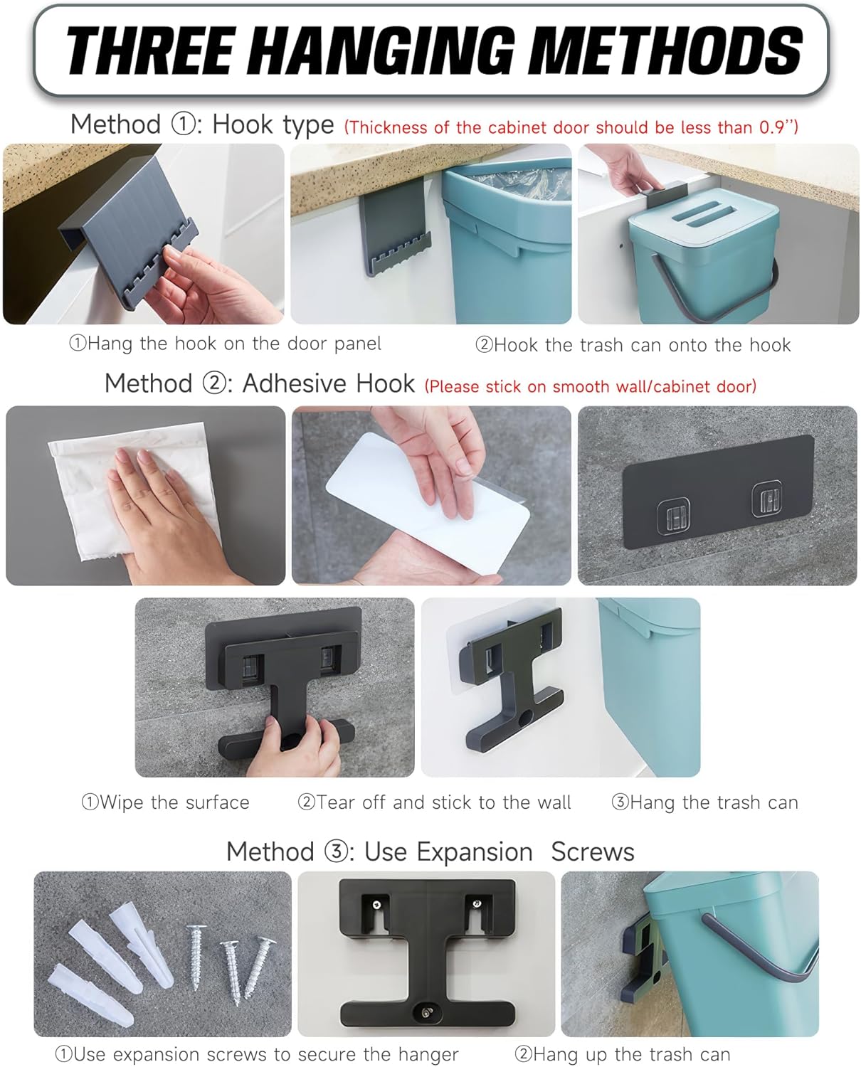 - β [Under Sink / Wall Mount Trash Can] Hanging trash is an excellent choice for your daily activities. You can use it while you cook and then store it under the sink. Fit for most cabinet doors, pantry doors, cupboards, under sinks, walls, and countertops.