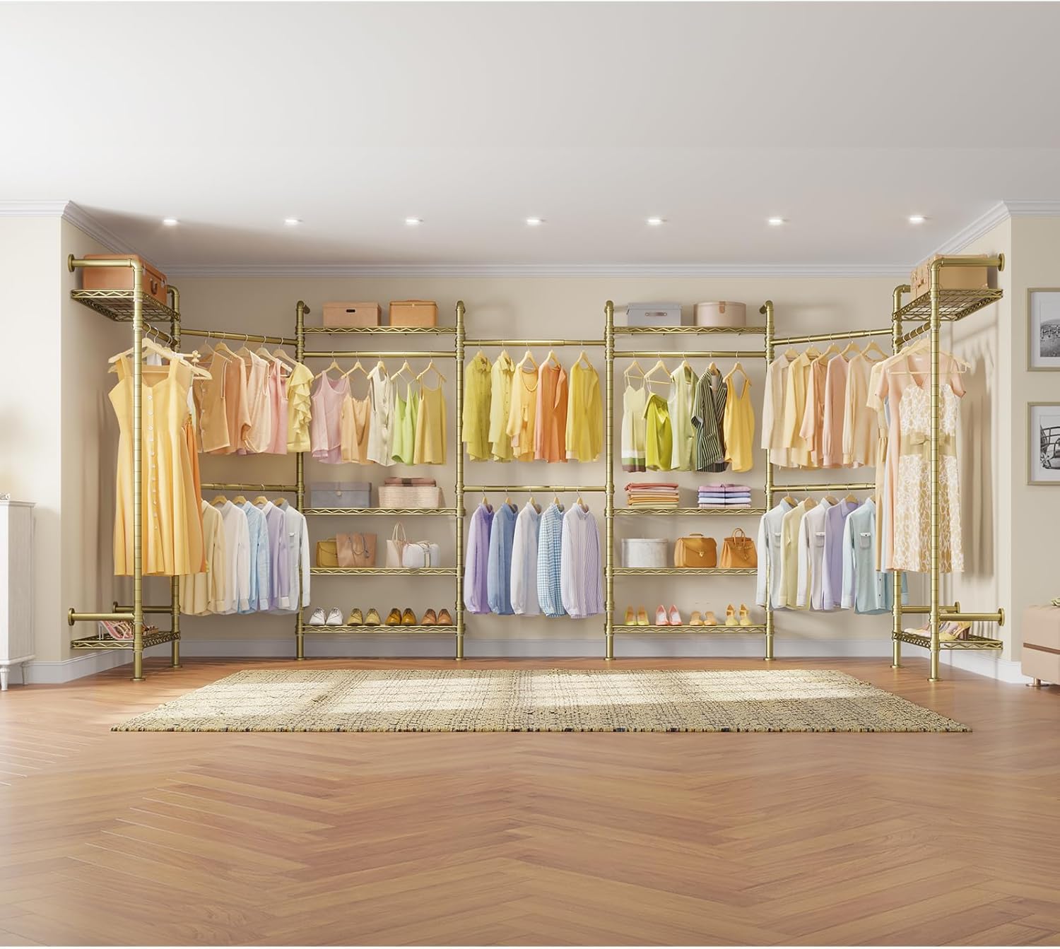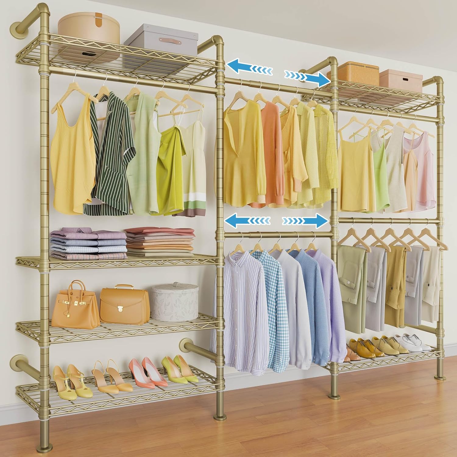 Timate F3 Garment Rack Heavy Duty Clothes Rack for Hanging Clothes, Expandable Industrial Pipe Wall Mounted Clothing Rack, Adjustable Storage Closet Wardrobe Closet Kit Walk in Closet Systems, Gold