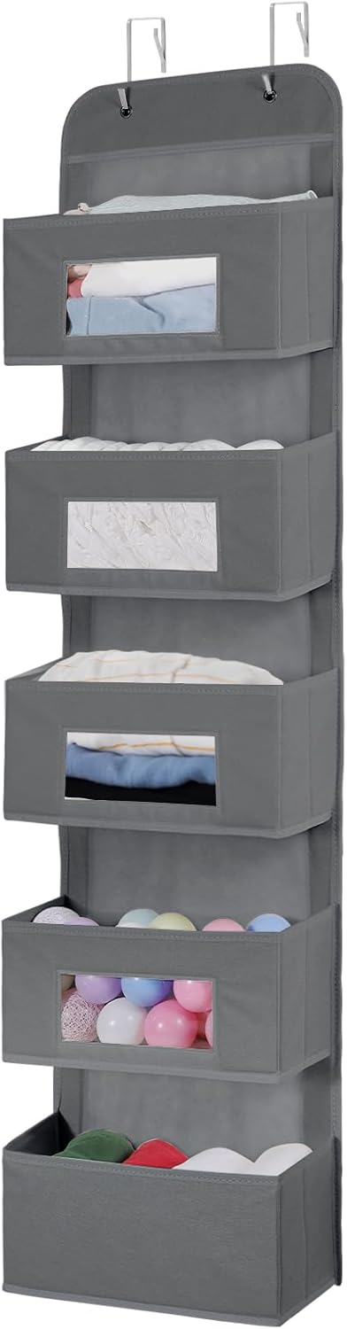 MAX Houser 5-Shelf Over The Door Hanging Organizer with 2 Metal Hooks, 5 Pocket Over The Door Wall Mount Storage with Clear Windows for Baby Nursery Bathroom Closet,Bedroom,Dorm,Diapers,Kids Toy(Gray)