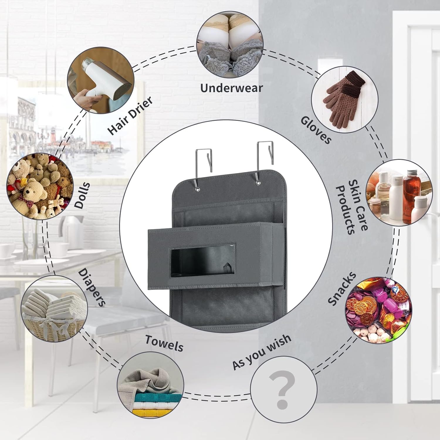 5-Shelf Over The Door Hanging Organizer with 2 Metal Hooks,5 Pocket Over The Door Wall Mount Storage with Clear Windows for Baby Nursery Bathroom Closet,Bedroom,Dorm (Gray-2 Pack)