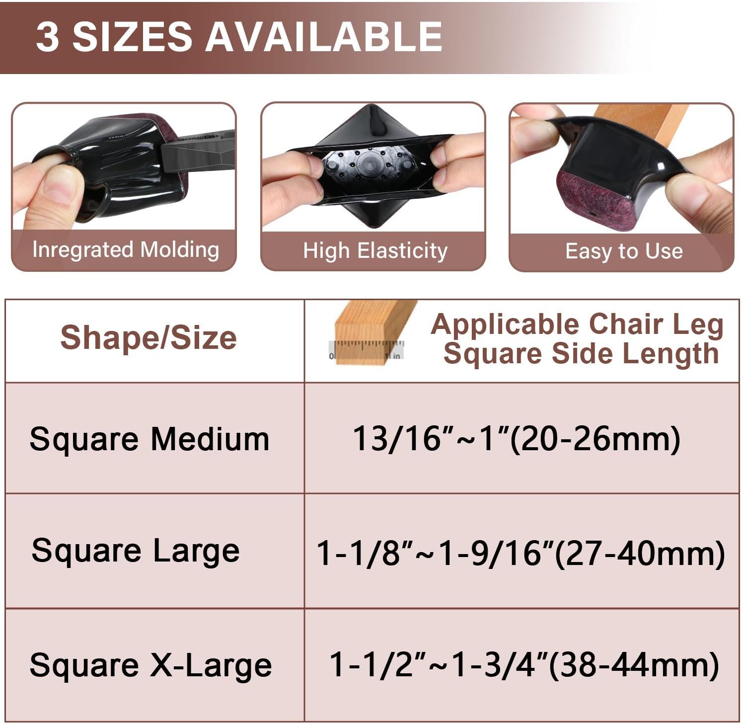 - [Stretchable fit a range of sizes]-Our chair leg floor protector is narrow at the top and wide at the bottom to adapt to various sizes. Fit square leg side length 1-1/8" to 1-9/16" (27-40mm).