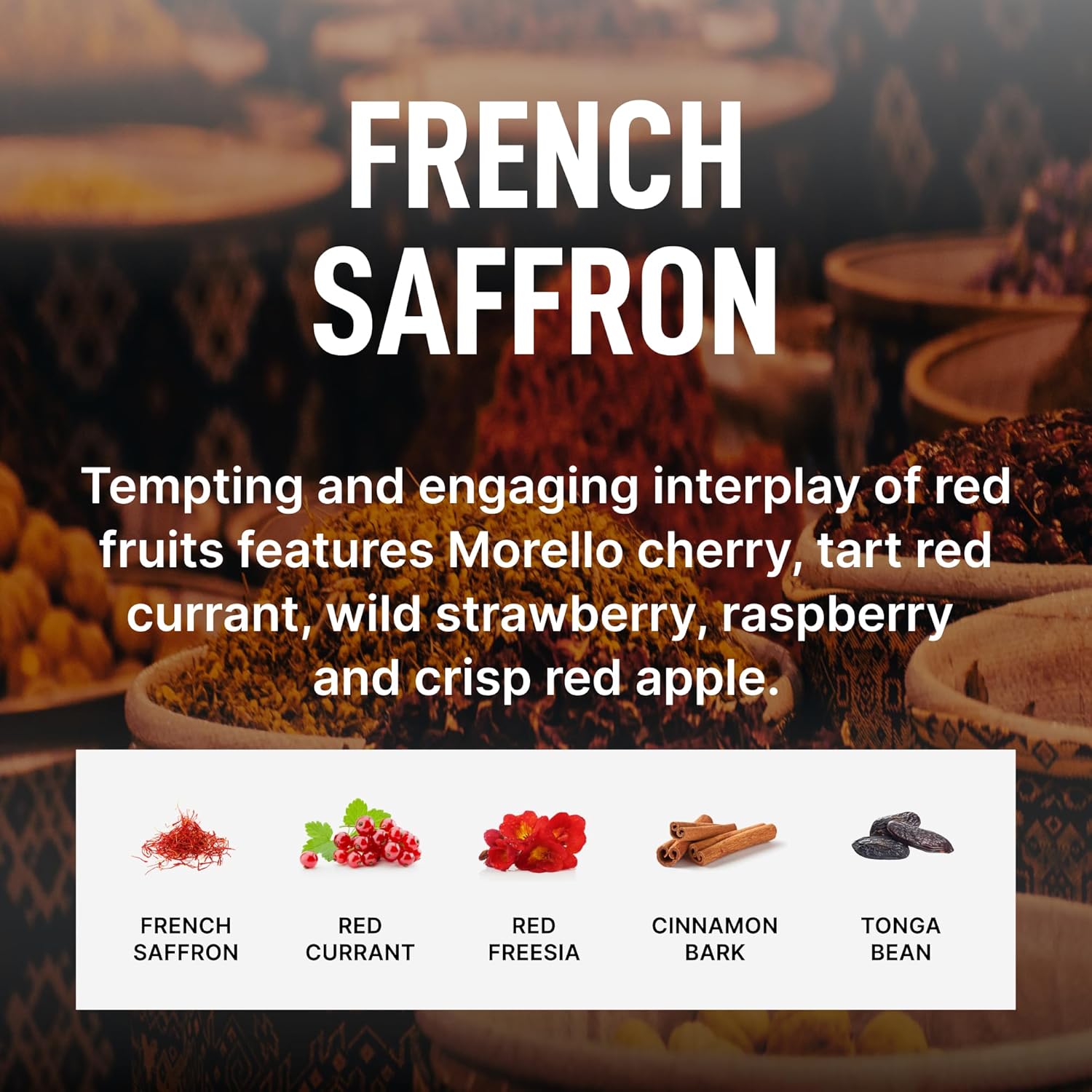 - French Saffron: A tempting and engaging interplay of red fruits featuring morello cherry, tart red currant, wild strawberry, raspberry and crisp red apple. Sensuality evolves with caresses of creamy caramel, amber, vetiver and cedar to which notes of intrigue and mystery are revealed in the French saffron, oakmoss, guaiacwood, cashmeran and tonka bean.
