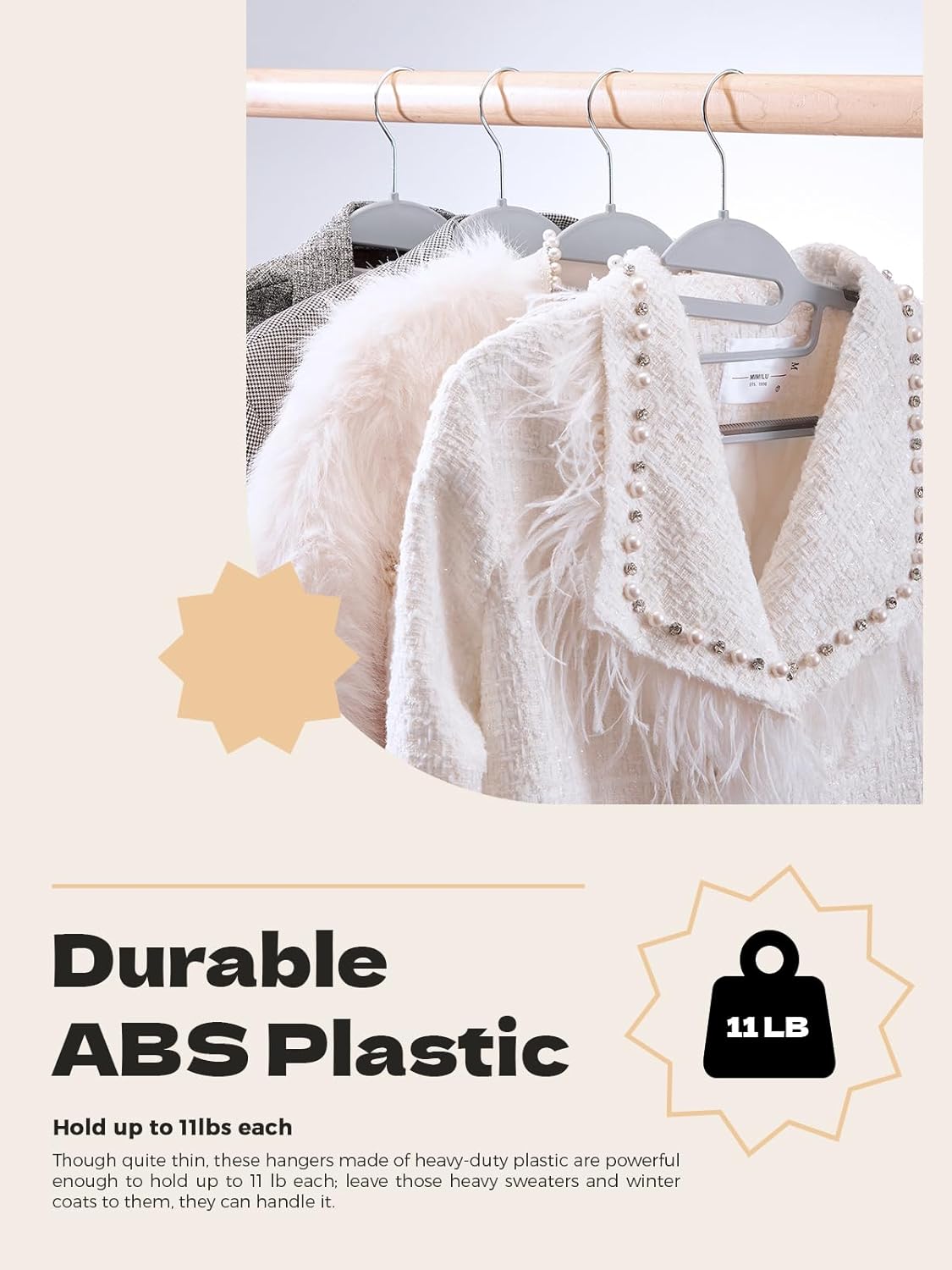- Heavy Duty Plastic Hangers - Our grey clothes hangers are made of luxury high standard grade ABS plastic that has been enhanced over time. Each hanger can hold large capacity up to 11lbs, so they are perfect for hanging your heavy coats, sweaters, and other clothing items.