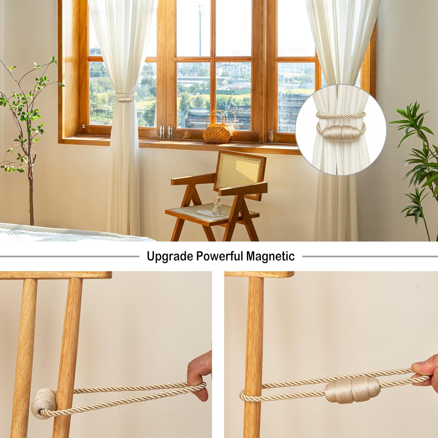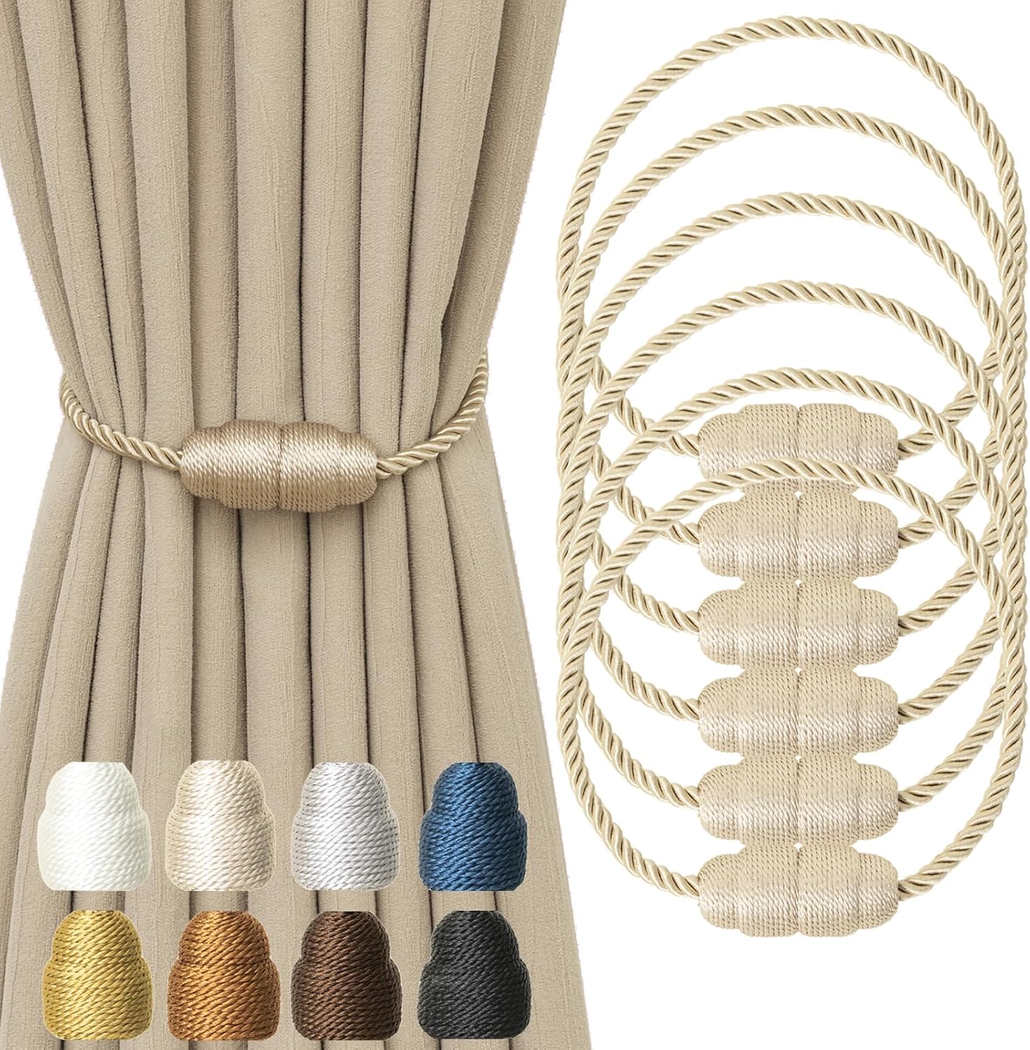 Magnetic Curtain Tiebacks - Rope Tiebacks for Curtains & Drapes, Decorative Window Holdbacks (6 Pack, Beige)