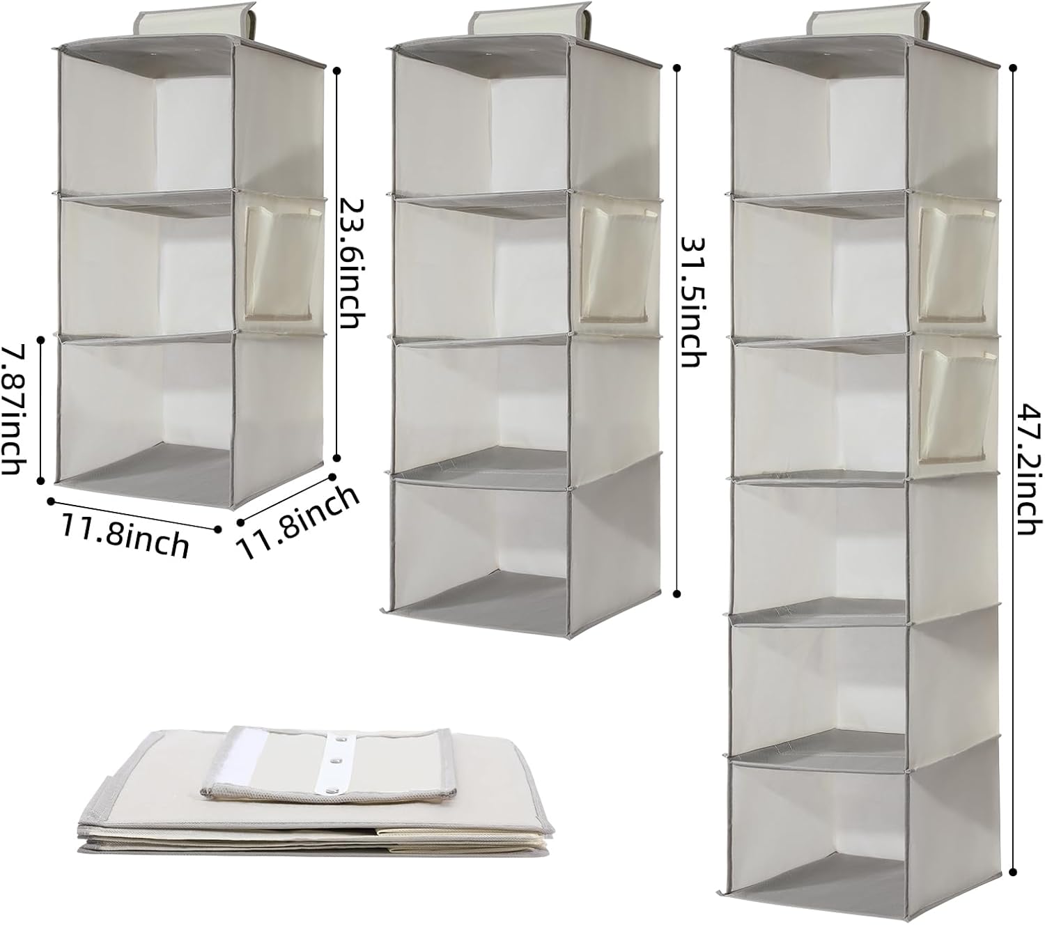 2 Packs Hanging Closet Organizer Storage, 3-Shelf Hanging Shelves for Closet, Closet Clothes Organizer and Storage with Side Pocket, Beige