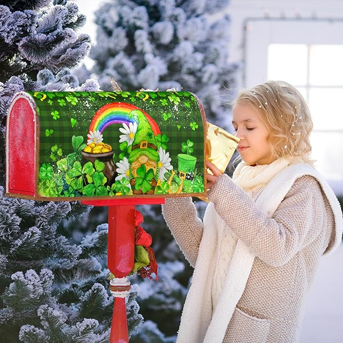 St. Patrick's Day Green Gnome Magnetic Mailbox Cover - Green Buffalo Plaid, Good Luck Leaf & Rainbow Design - Standard Size 25.5x21 Inch for Home & Outdoor Garden