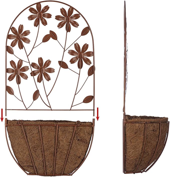- Set of 2 Wall Planters: These half round wall planters come with coconut fiber liners, and the frames feature that little daisies are in full bloom. The natural patina appearance nicely complements any decor or color scheme.