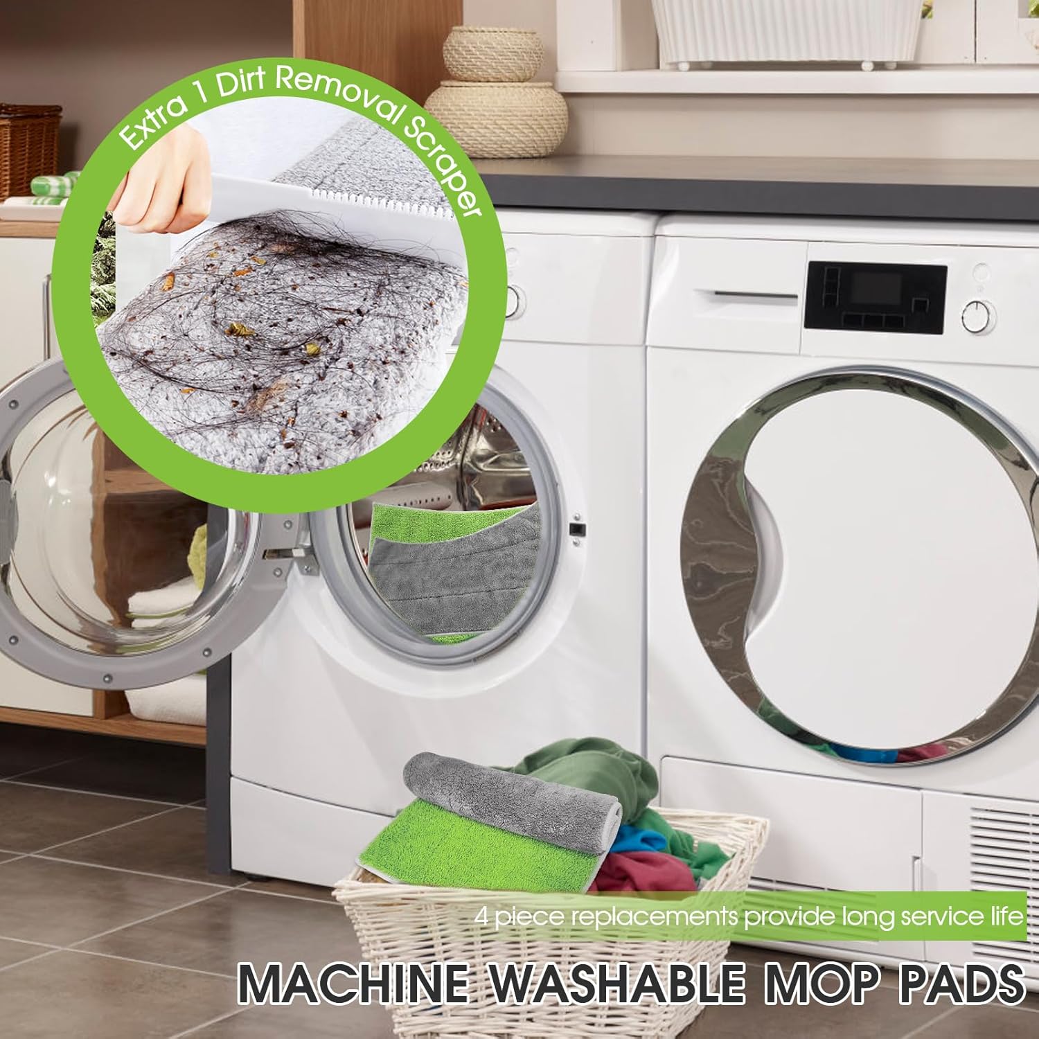 - 【4 Double-sided Microfiber Pads】Flat mop come with 4 washable and reusable microfiber mop pads. The chenille fabric has good water absorption and is ideal for dry mopping, while the microfiber mop pad is perfect for deep cleaning. It also includes a dirt removal scraper for easy cleaning.