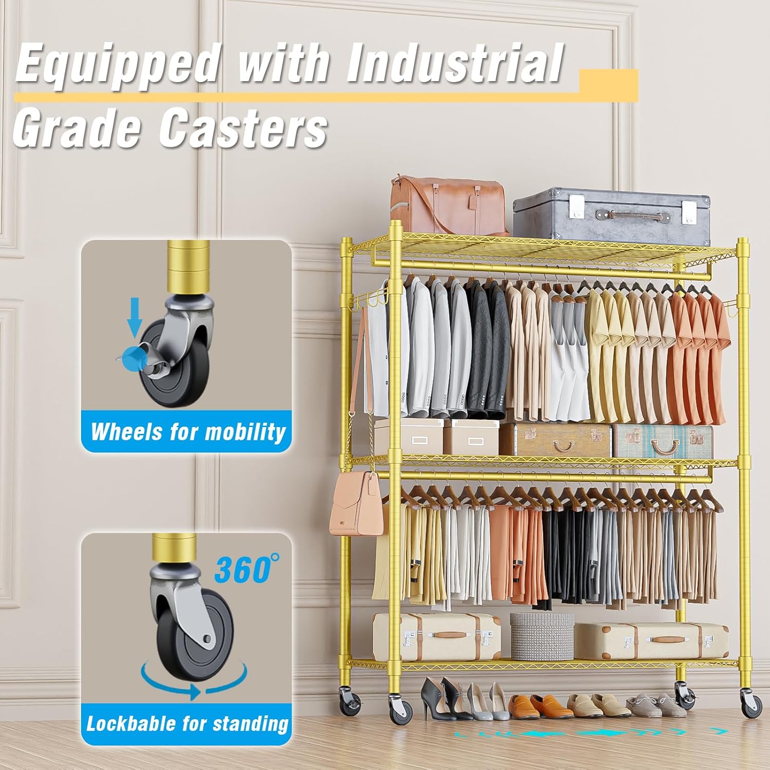 Homdox Gold Heavy Duty Clothes Rack with Wheels, 3-Tier Rolling Metal Garment Organizer with Double Hanging Rods & Hooks, Freestanding Portable Closet, 17.72" D x 47.24" W x 80.71" H