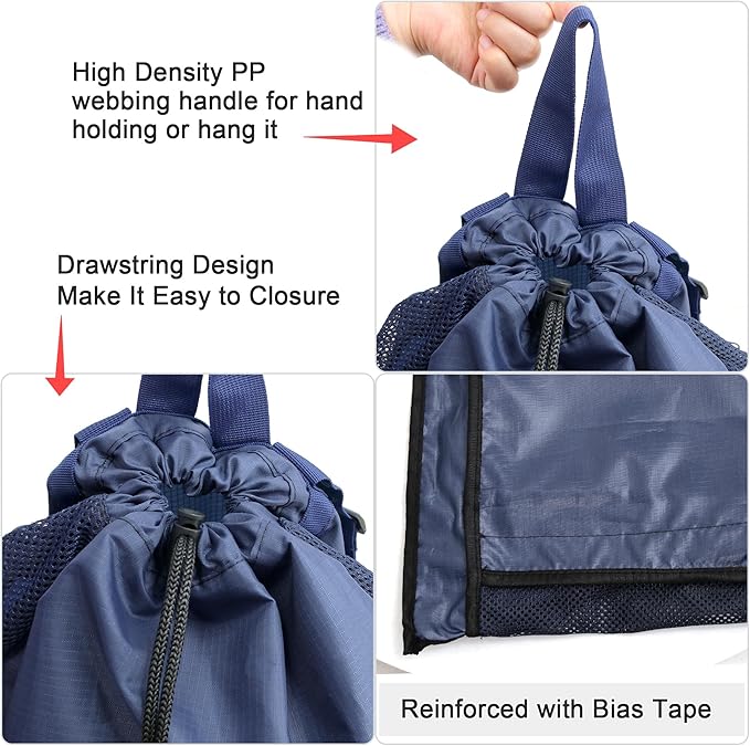 - Handle Design & Comfortable Adjustable Straps: The drawstring backpack has a high-density pp webbing handle for hand-holding or hanging. And adjustable straps of this gym backpack can fit any kind of person. Backpack design can free up your hands. It's more convenient to use a drawstring seal to keep your stuff safe. Our drawstring swim bag is perfect for the gym bag, swim bag, workout gear bag, basketball bag, soccer bag, sports bag, and beach gear bag.