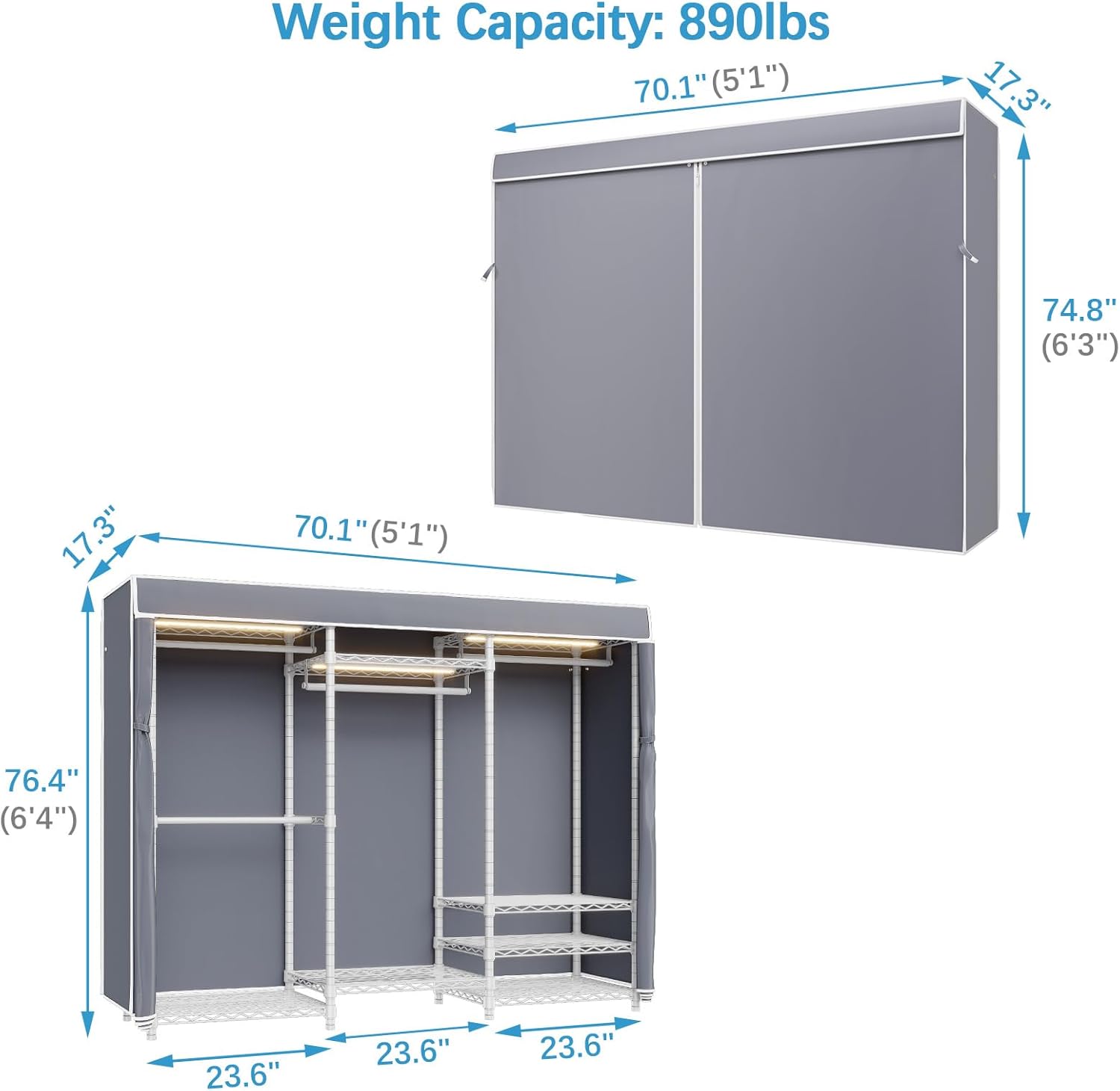 VIPEK V5LC Garment Rack Heavy Duty Covered Clothes Rack with Dimmable LED Lights, 3000K Warm White, Portable Closet Wardrobe Freestanding Clothing Racks for Hanging Clothes, White Rack with Grey Cover
