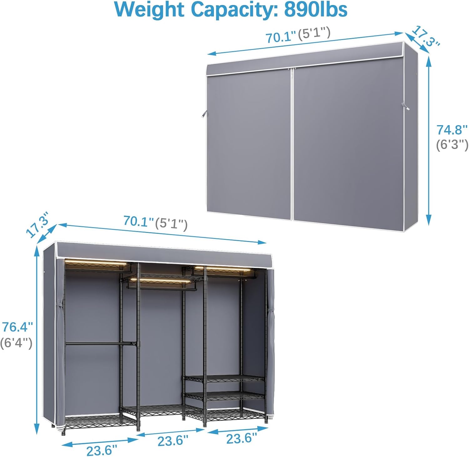 - Dimensions & Load Capacity: 70.1" L x 17.3" W x 76.4" H (includes cover). Load capacity up to 890 lbs. Single hanging rod can support up to 88 lbs, Wire shelf can support up to 90 lbs for each.