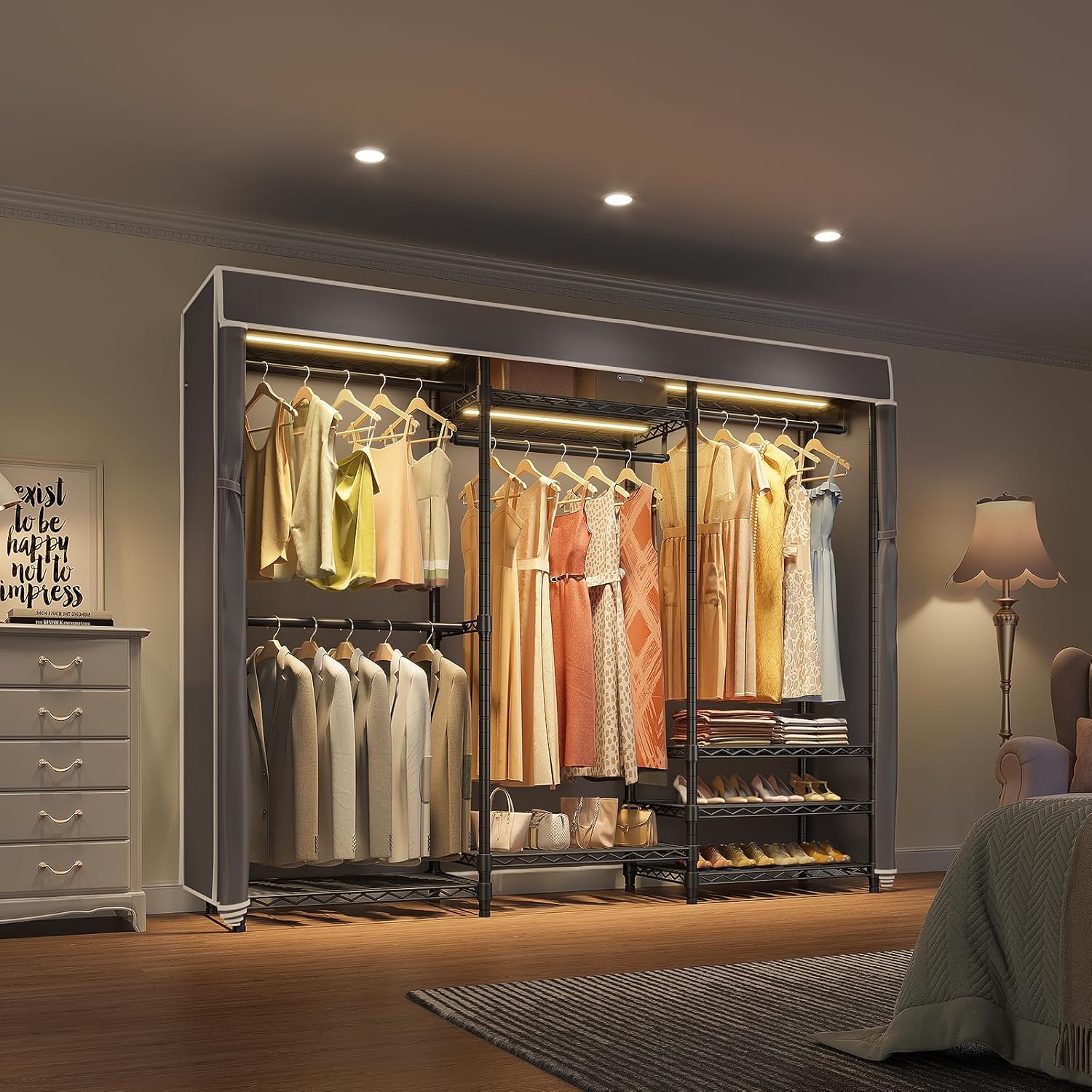 VIPEK V5LC Garment Rack Heavy Duty Covered Clothes Rack with Dimmable LED Lights, 3000K Warm White, Portable Closet Wardrobe Freestanding Clothing Rack for Hanging Clothes, Black Rack with Grey Cover