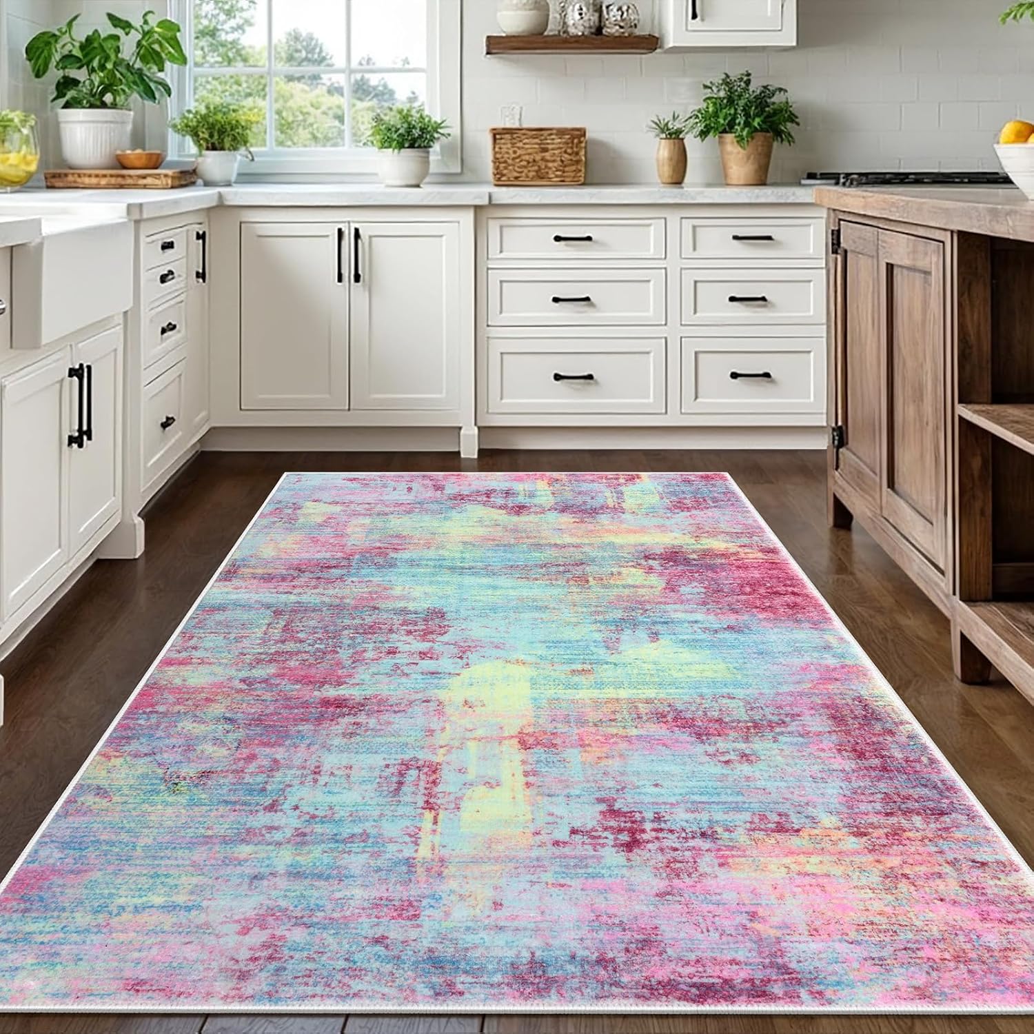 - Modern Abstract Printed Design: Transform your home with the modern abstract rug, a perfect blend of art and functionality. Printed with a modern abstract pattern, Its dynamic splashes of pink, teal, and yellow hues add a vibrant touch to any room