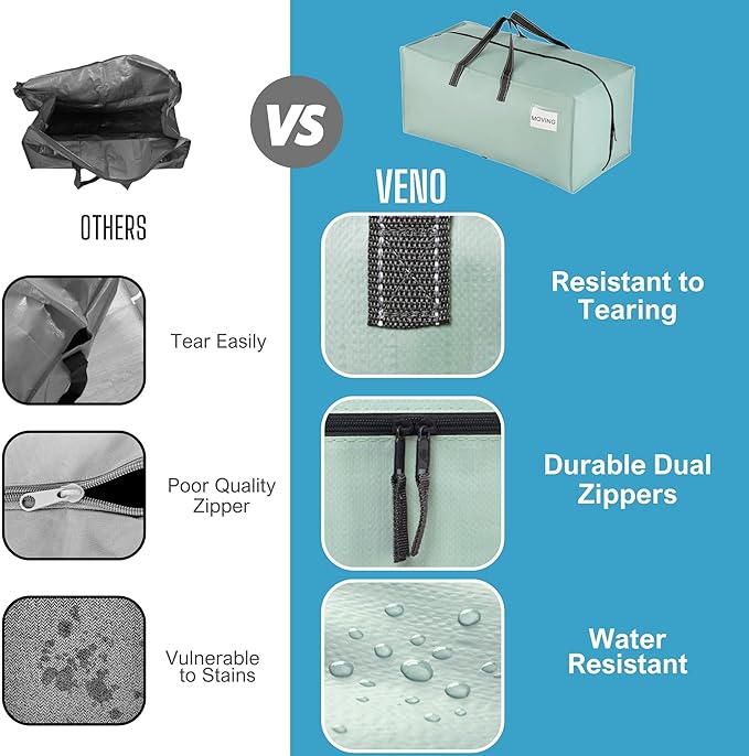 - Hassle-Free Move without Boxes β No need to buy or assemble packing boxes or look for moving supplies. Streamline your move with VENO strong and spacious heavy duty moving bags that make a lightweight, convenient, and economical alternative to moving boxes. Just unfold, unzip, and begin loading to move your essentials into your college dorm room or new home! Use a wipe or damp cloth to clean & followed by air-drying. Collapse and fold flat to store in your drawers, cabinets, or shelves.