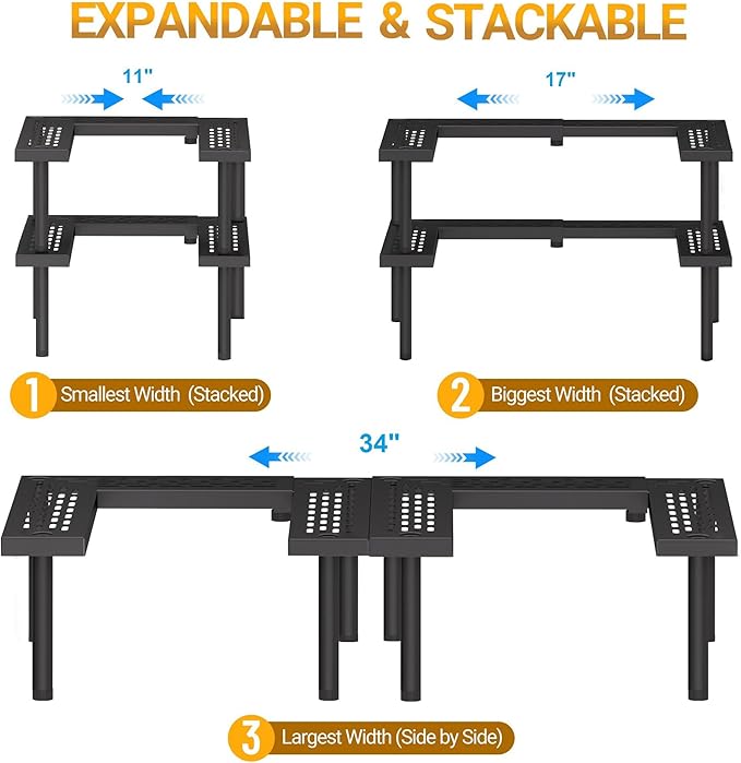 - 【Expandable Adjustable】The seasoning organizer has adjustable width and height to fit different size cabinet space. Its width can be adjusted from 11" to 17" and height from 4.9" to 5.4". You can either stack them or use as two separate shelves according to the space of the usage scene or your individual needs.
