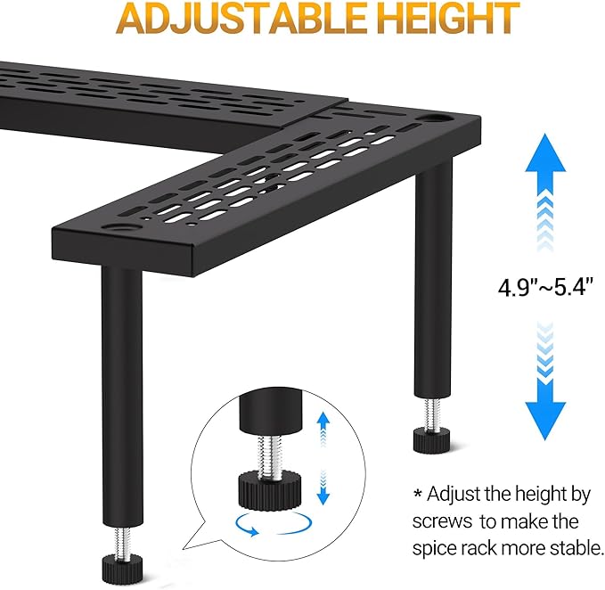 - 【Sturdy Durable】This spice organizer for cabinet is made of high-quality metal, which is sturdy and not easily deformed, and has a good bearing capacity. The surface is coated with waterproof and anti-rust coating, matte black nano coating, so that you can use it for a longer time, and it will not rust and fade over time.