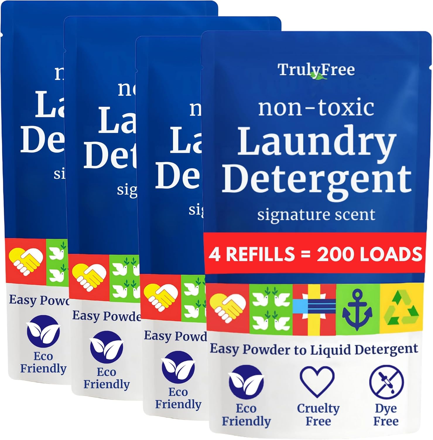Truly Free Natural Laundry Detergent for Sensitive Skin | Eco Friendly, Plant Based, Baby Clothes Safe | Clean & Easy Powder to Liquid, 4 Pack Refill Detergent, NO Jug | Signature Scent, 200 Loads