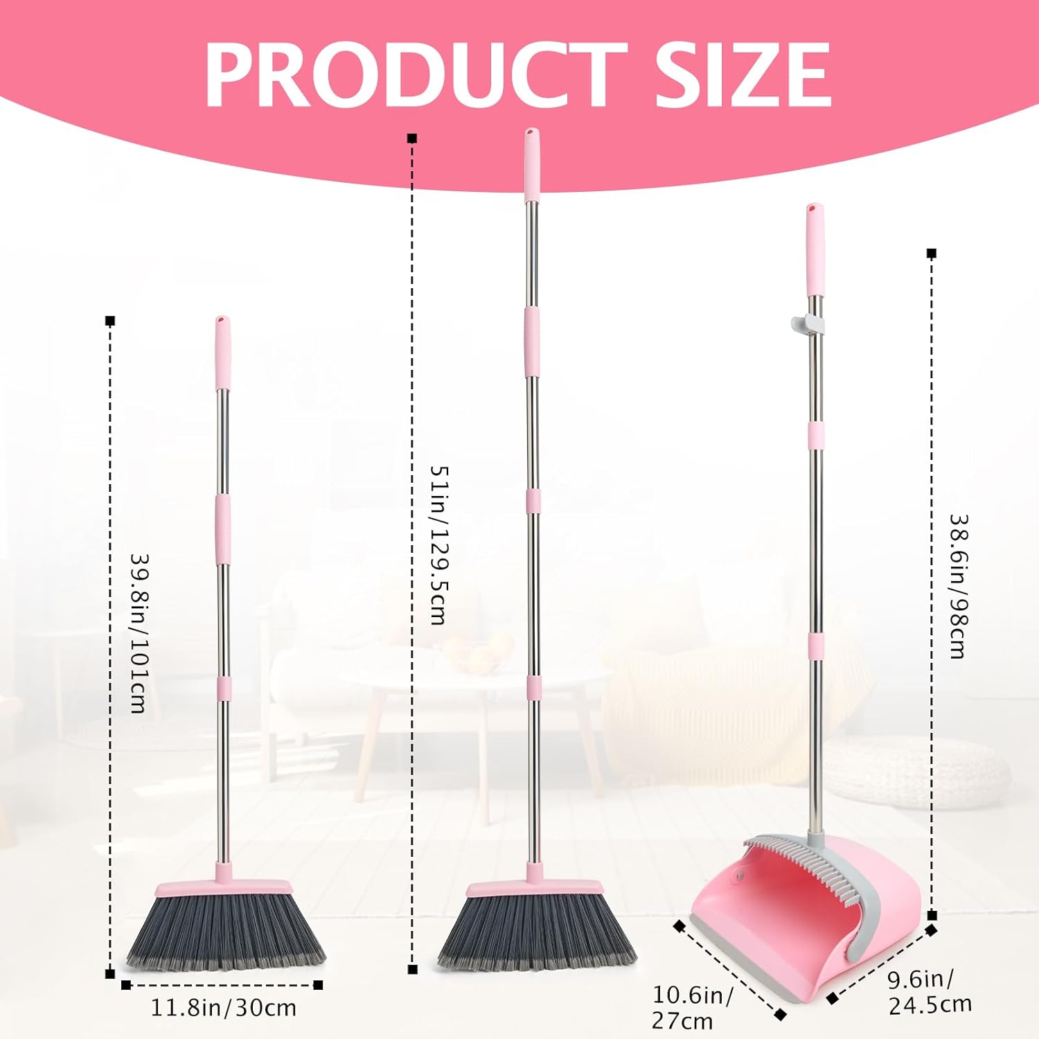 - ăExtendable HandleăThe optional extension pole makes the broom length from 39.8 inches to 51 inches, the dustpan length is 38.6 inches. You can choose the appropriate length according to your height, making it easy to clean while standing upright.