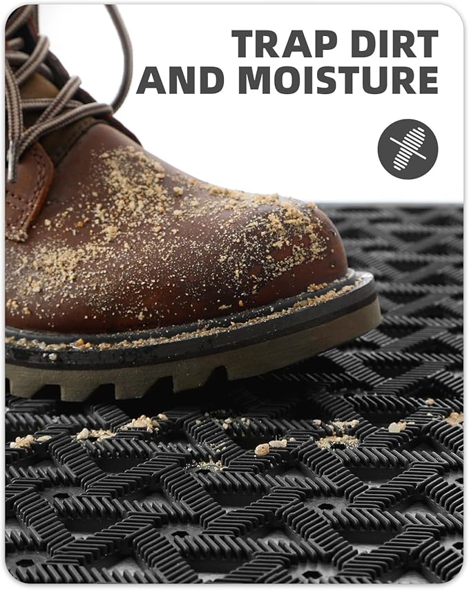 - CAPTURE DIRT & MOISTURE: Our front door mat is designed with deep grooves and a beveled rubber border, creating a powerful barrier against dirt, mud, debris, and moisture; The innovative retention dam ensures that all unwanted elements are captured and contained, so your floors stay clean and dry