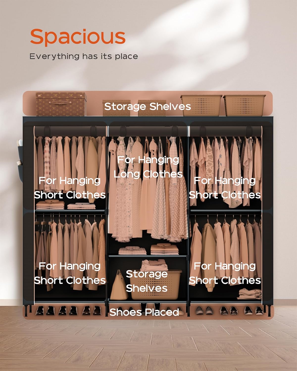 - [Stable and Strong] Featuring with steel tubing, high quality non-woven fabric and durable connectors, this wardrobe ensures long-lasting stability and support. Each hanging rod holds 44 lb and Each shelf holds up to 22 lb.