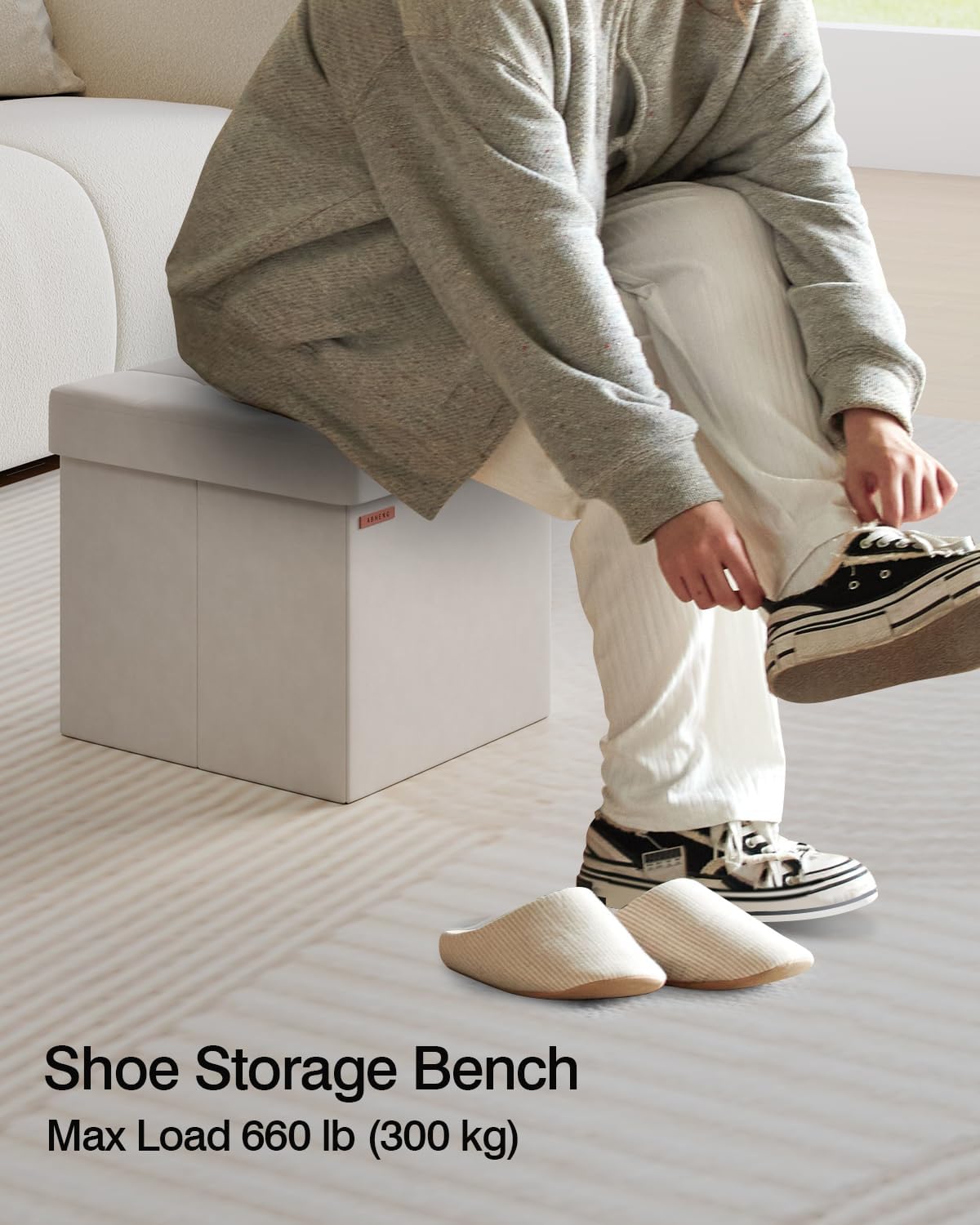 - VERSATILE FUNCTION: Transforming fluidly into a coffee table, storage box, footstool, end of bed bench, or shoe bench, the Storage Ottoman is an essential addition to any living room, bedroom, corridor, or any other space. With its sleek finish and neutral color palette, it effortlessly blends with any decor, enhancing the aesthetic of your home.