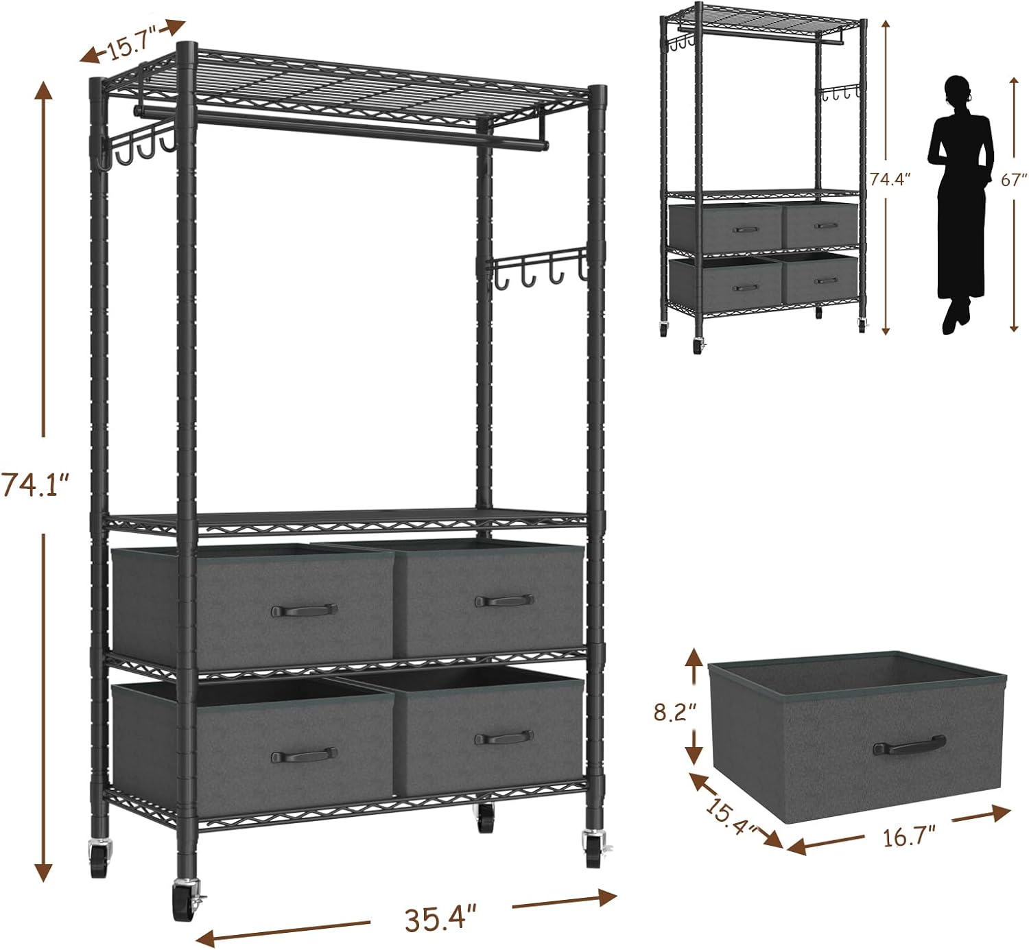 Clothes Rack, Heavy Duty Clothing Rack for Hanging Clothes, 4-Tier Adjustable Closet Organizer with 4 Drawers | Hanging Rod | Side Hooks | Load 445lbs | 15.7" D x 35.4" W x 74.1" H