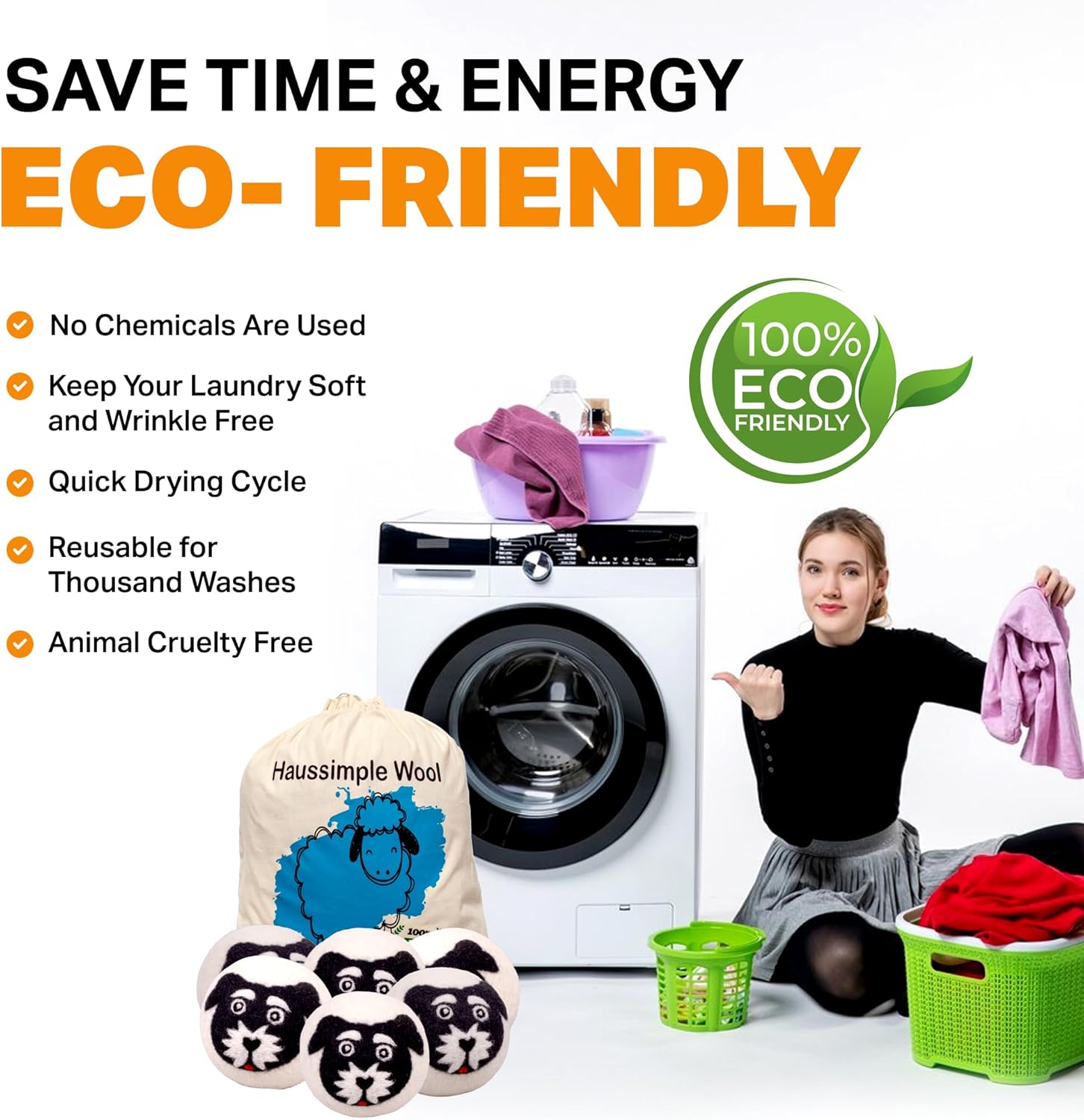 Wool Dryer Balls Organic Felt 6 Pack Laundry Fabric Softener, Extra Large Reusable Handmade Natural Sheep Wool Lint Wrinkle Free Anti Static Baby Safe (Black White Dog)