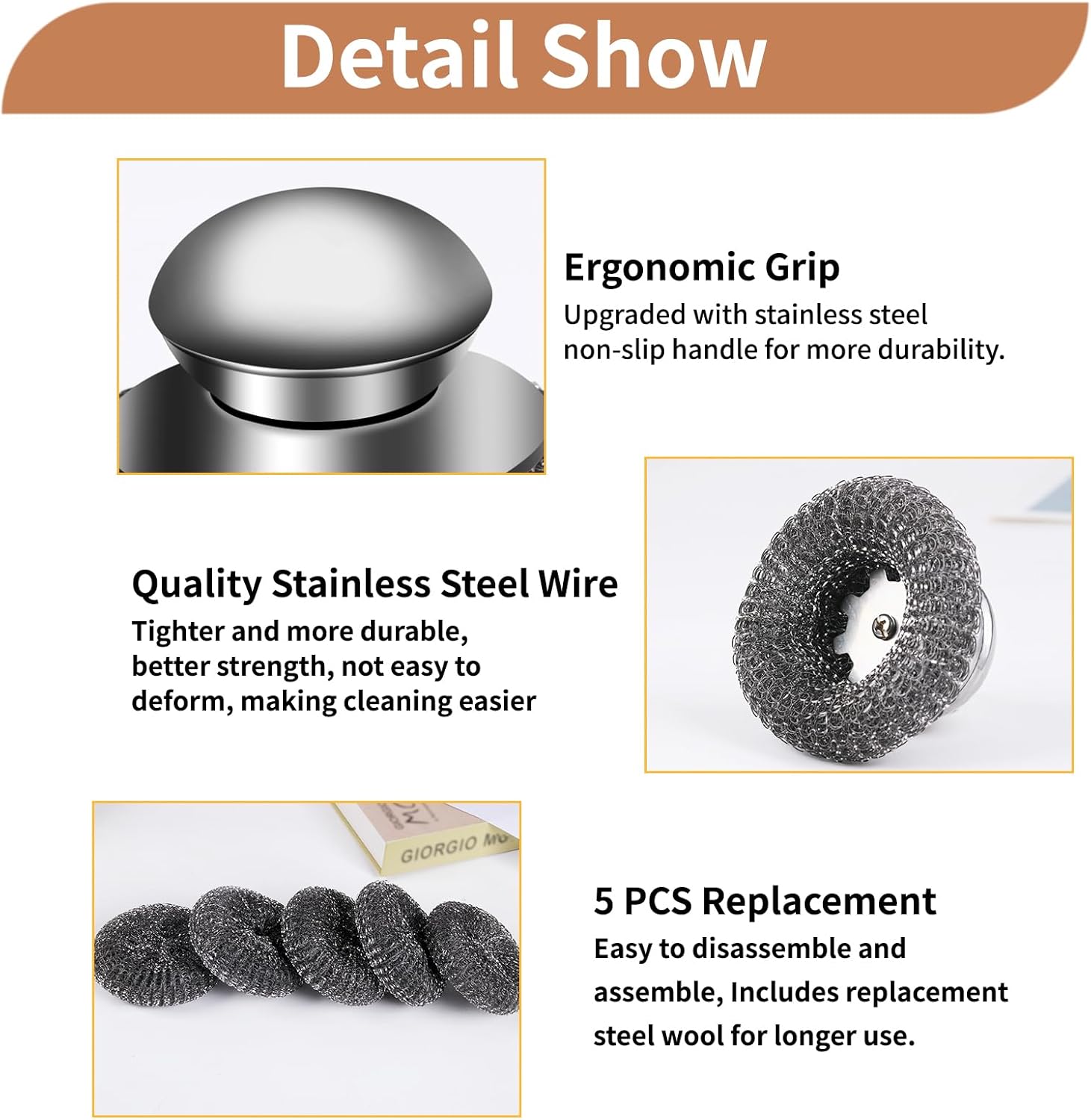 6Pcs Steel Wool Scrubber with Replacement Wire Pads Set, Stainless Steel Scrubber with Handle for Scouring Stubborn Messes from Cast Iron, Pots, Pans, Grill, Stoves, Sink(1 Scrubber+5 Pads)