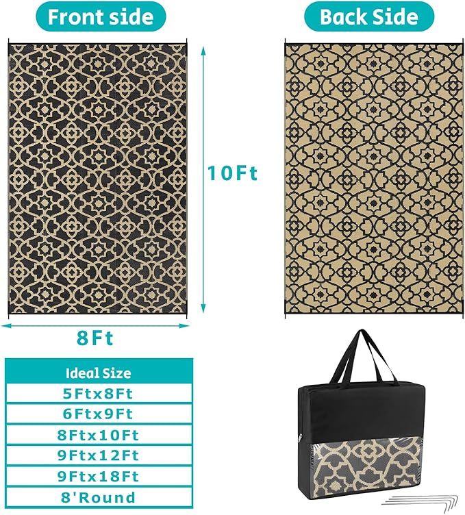 - Versatile Outdoor Carpet: The indoor outdoor plastic rugs have multiple choice in different colors(4'x6',5'x8',6'x9',8'x10',9'x12',9'x18',8'round), is ideal for a variety of indoor outdoor activities,like patio mat, deck rug, garden rug, beach mat, picnic mat, BBQ party mat, rv camping rug,pool rug,outdoor doormat,garage rug,front door mat,allowing you to have plenty of imaginable space for more fun.