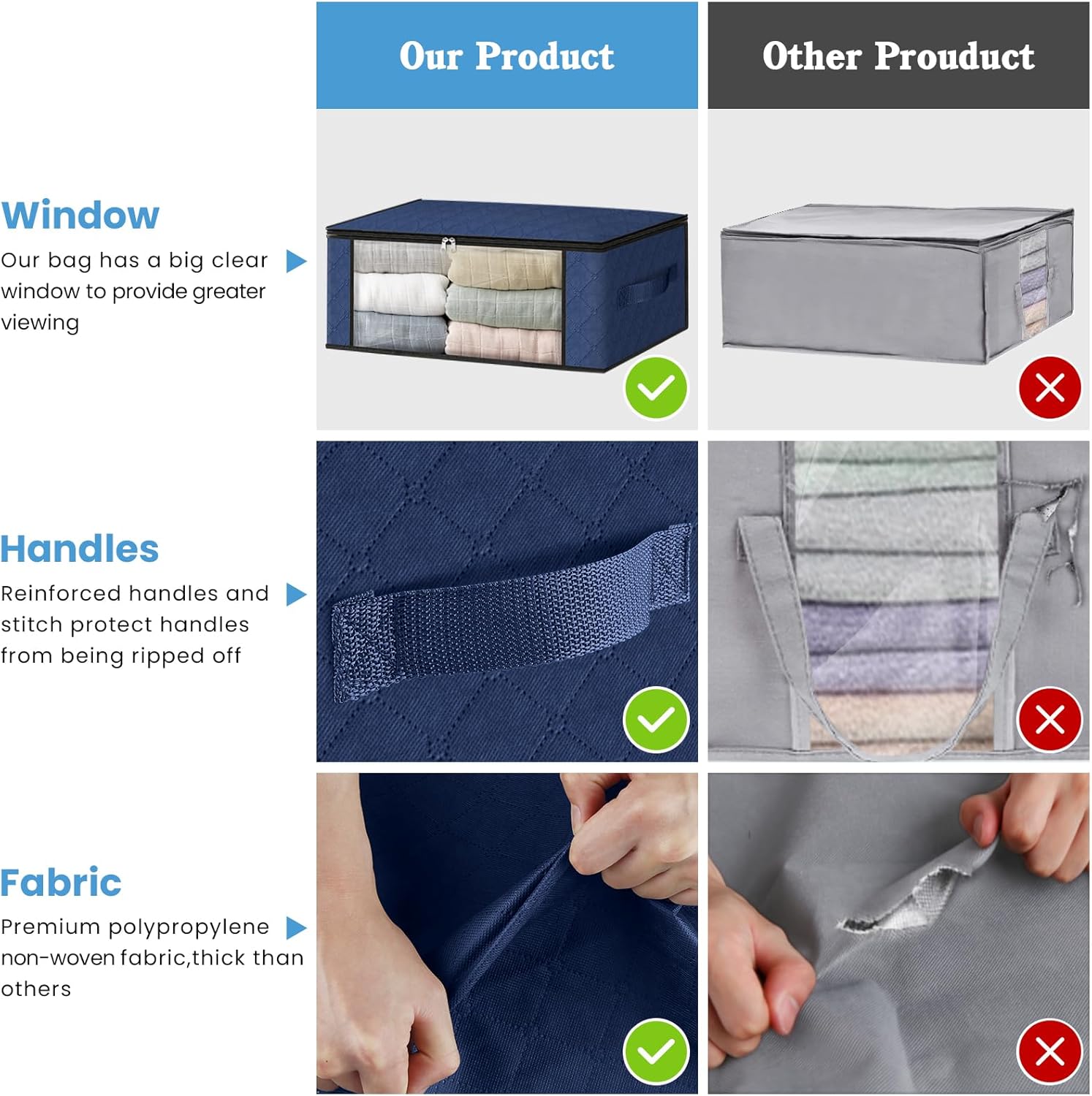 HomeHacks Storage 4-Pack Clothes Organizer Storage Bags Foldable Storage Box with Large Clear Window Sturdy Handles for Closet, Dorm, Pillows, Bedding, Clothes, Blankets, 35L, Blue