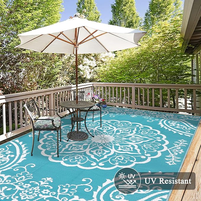 Pauwer Waterproof Outdoor Rug 9x12, Reversible Plastic Straw Patio Camping Rug, Indoor Outdoor RV Mat Carpet for Deck, Camper, Porch, Balcony, Backyard, Picnic, Boho Teal