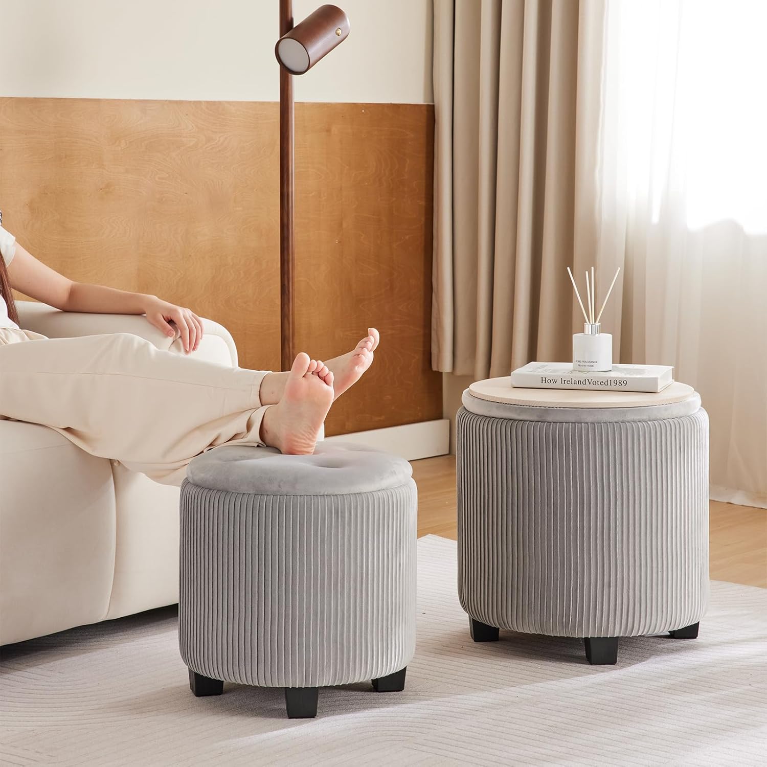 - ăVersatile and Practical FootstoolăThe set of 2 ottoman round can not only be used to store your extra items, but also can be a footstool ottoman when you watching TV for bedroom, a stool when your friends come to have a coffee with you for living room, a vanity stool when you put on your makeup beside vanity table.