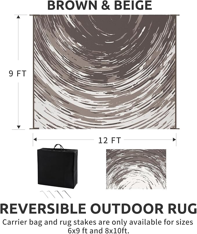 - RV traval&Camping: This camper must haves outdoor rug is ideal for picnics, gatherings, and RV trips! The lightweight outdoor camping carpet with foldable lines is easy to carry and saves space. Includes an extra carry bag and rug stakes for 6x9 ft, 8x10 ft and 9x12 ft. Grass-friendly, durable, and easy to clean, this outdoor rug enhances outdoor adventures.