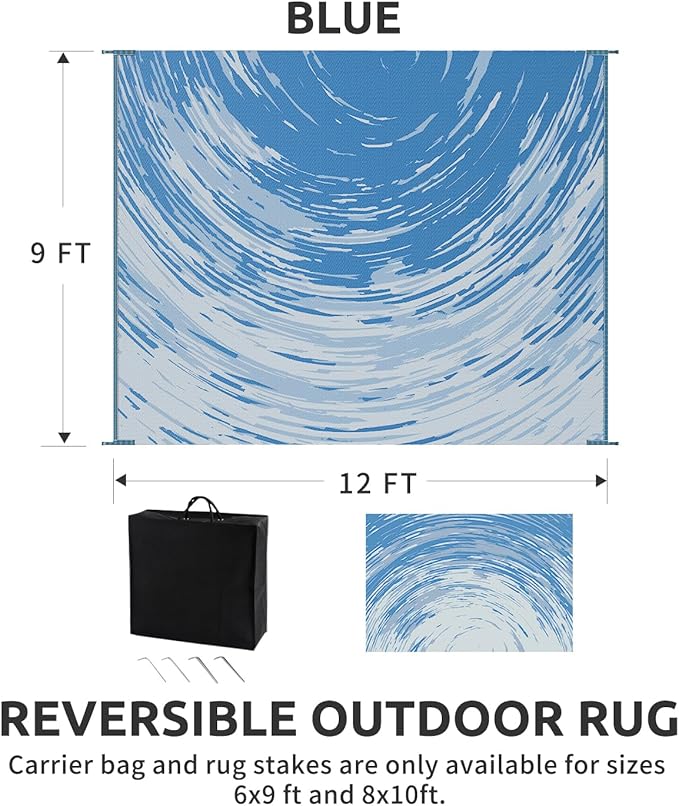 • RV traval&Camping: This camper must haves outdoor rug is ideal for picnics, gatherings, and RV trips! The lightweight outdoor camping carpet with foldable lines is easy to carry and saves space. Includes an extra carry bag and rug stakes for 6x9 ft, 8x10 ft and 9x12 ft. Grass-friendly, durable, and easy to clean, this outdoor rug enhances outdoor adventures.