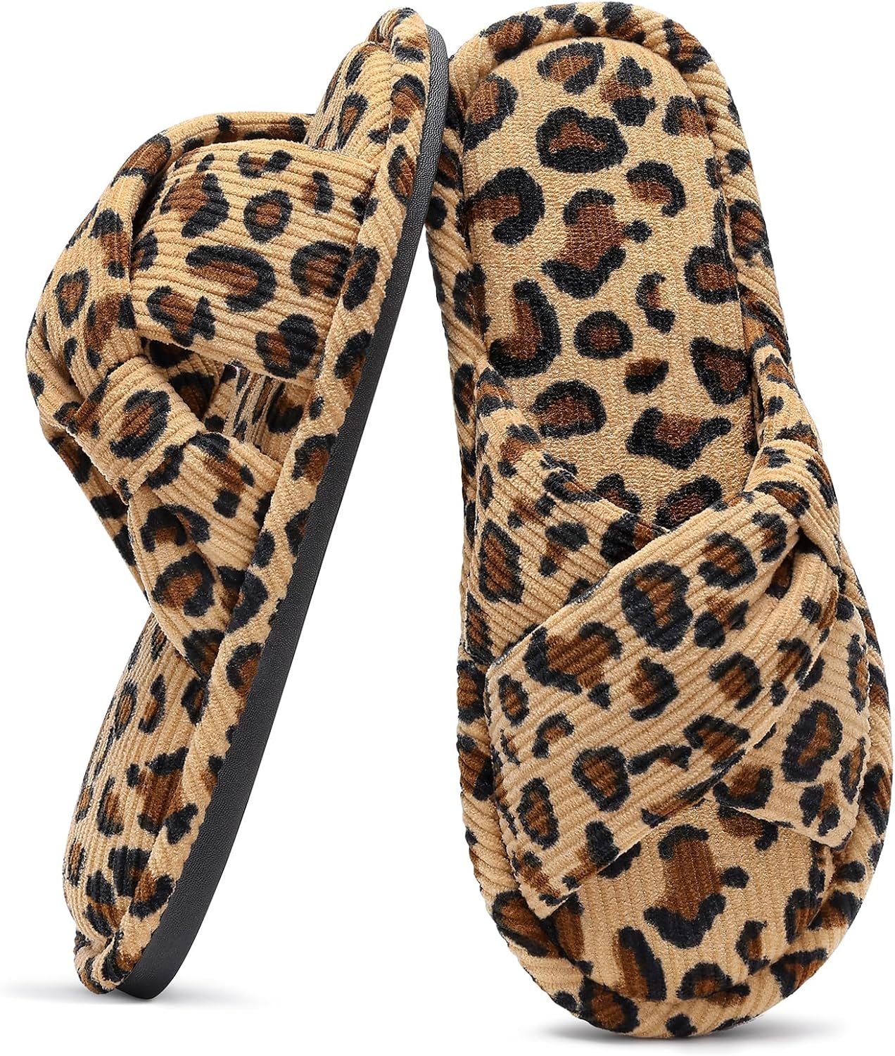 Evshine Summer House Slippers for Women Corduroy Cross Bow Indoor Slippers Open Toe Slip On Bedroom Shoes with Memory Foam
