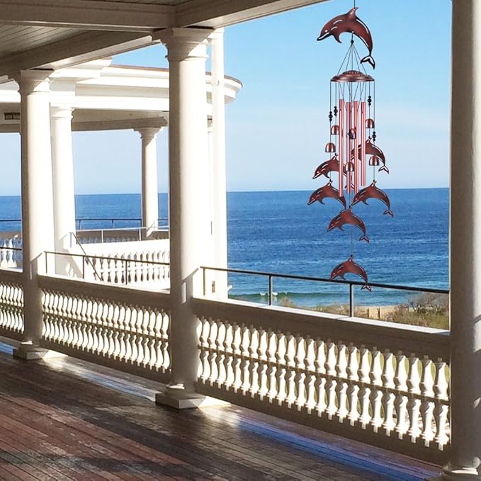 - UNIQUE DESIGN: Dolphin wind chimes, pure hand-made with 4 red copper durable aluminum tubes. 1 round metal caps. 7 cute dolphins,6 bells, 18 small lucky beads, 1 hook up. From the hanging ring to the bottom hanger, whole wind chimes measures 38 inches. Each metal tube has its own unique tone when it collides. Enjoy the wonderful music to soothe your body and mind. Enjoy peaceful melodies it plays. The sound is soft, clear and relaxing.